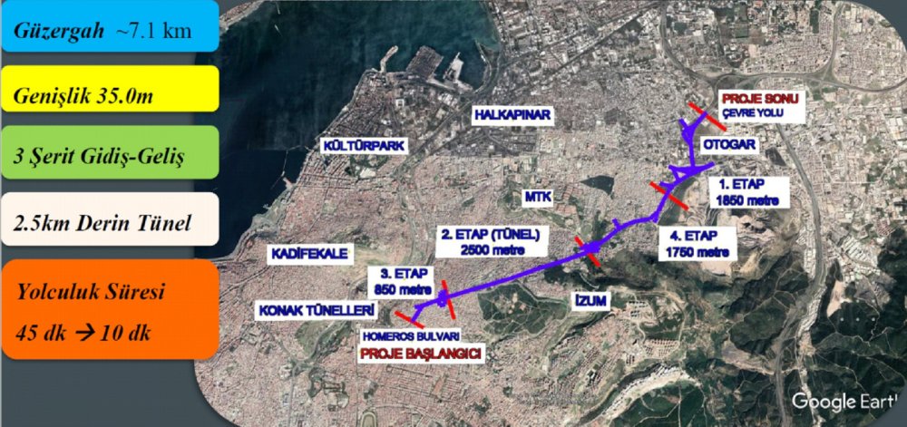 7,1 kilometrelik güzergah 35 metre genişliğinde 3 geliş 3 gidiş toplam 6 şerit bölünmüş yol ile 2,5 kilometrelik çift tüp 2 şerit gidiş - 2 şerit geliş toplam 4 şerit derin tünelden oluşuyor.Tünel ve viyadük projesi ile Çamlık, Mehtap, İsmetpaşa, Ufuk, Ferahlı, Ulubatlı, Mehmet Akif, Saygı, Atamer, Çınartepe, Merkez, Zafer, Birlik, Koşukavak, Çamkule, Meriç, Yeşilova ve Karacaoğlan mahalleleri aşılarak Bornova Kemalpaşa Caddesi’nden Otogar'a bağlantı sağlanacak. Homeros Bulvarı ve Onat Caddesi üzerinden İzmir'in en uzun tünelini geçen araçlar, şehrin yoğun trafiğine girmeden Otogar ve çevre yoluna ulaşabilecek. Dev yatırım tamamlandığında kent içi trafik rahatlayacak, şehir trafiğine girmeden Buca’daki Homeros Bulvarı, Işıkkent’teki İzmir Otogarı’na bağlanacak.
