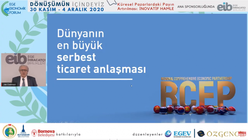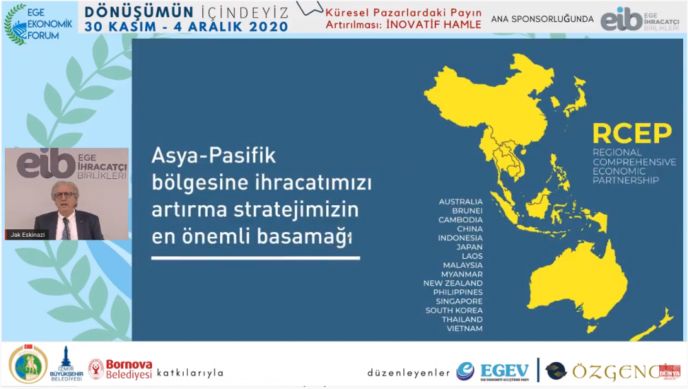 Jak Eskinazi, 2020 yılının başında Davos Zirvesi’nden çıkan ortak çağrıyı hatırlattı: “Toplumun sorunlarını sadece konuşmak yeterli değil, sorunların ciddiye alınması ve çözümlere yatırım yapılması gerekiyor.” ve şöyle devam etti:“Arkamızda bizi yaşatabilecek tek zenginliğimizin, ürettiğimiz katma değerler olacağını unutmamalıyız. İşte bu yüzden, çağa ayak uydurmalıyız. Küresel tedarik zinciri değişiyor. Ülkeler pandemide tek pazara bağımlılığın sıkıntılarını gördü. Bu yüzden yeni bölgesel hatların oluşturulması için adımlar atılıyor. Çok yakın bir süreçte Çin’in de aralarında olduğu 15 Asya Pasifik ülkesinin imza attığı tarihin en büyük ticaret anlaşması RCEP de (Bölgesel Kapsamlı Ekonomik Ortaklık) tedarik zincirleri için alınmış bir önlem. Anlaşma aynı zamanda dünya ticareti için çok önemli mesajlar barındırıyor. RCEP’e imza atan 15 ülkeyle dış ticaretimizi geliştirebilirsek, ülkemize de bölgede yeni ihracat pazarları açılabilir.”