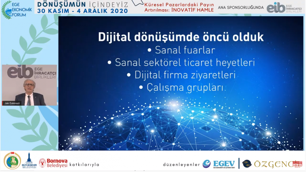 Ege İhracatçı Birlikleri’nin dijital fuarcılıkta Türkiye’de ve dünyada öncü olduğunu anlatan Eskinazi, Hollanda, Birleşik Arap Emirlikleri ve Vietnam’a sanal sektörel ticaret heyetleri düzenlendiğini Avrupa pazarı için çalışmaların devam ettiğini açıkladı.“Dünyanın en önemli Endüstri 4.0 bölgesi Bavyera’ya dijital firma ziyaretleri etkinliği ve iş forumu organize ettik. Blockchain teknolojisi artık her yerde, dünyadaki bütün endüstrilerde, tedarik zincirlerinde ve lojistikte kullanılıyor. 2020’nin başında Sürdürülebilirlik, Blockchain ve Dijital dönüşüm çalışma gruplarını kurduk. Birliğimizin hizmetlerini, faaliyetlerini dijital ortama aktarmayı ve hızlandırmayı, üyelerimizin dijital ekosistemin önemli oyuncuları olmalarını istiyoruz. Bu yüzden birlik üyelerimiz için bir ticaret platformu oluşturuyoruz ve eğitim programları planlıyoruz. Bu yolda bizim için kadın ihracatçılarımızın emeğinin ve çabasının yeri çok ayrı. İş’te Kadın cephesinde Binyaprak İş’te Kadın dijital deneyim platformunun İzmir Çemberi’nin kuruluşuna destek veriyoruz. Kadın ihracatçılarımızın deneyimlerini paylaşacakları özel bir içerik üretip, ihracata yönelmek isteyenlere rehberlik edecek bir mentorluk programını hayata geçireceğiz.”