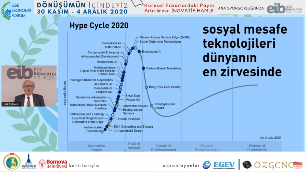 Eskinazi e-ticaret sektörünün ekonominin belkemiği KOBİ’lerle hızlı büyüyebileceğini, KOBİ’lerin e-ticarete geçişiyle e-ihracatın da gelişeceğini söyledi. “Dünyada e-ticaret pazarının 2022’de 6,5 trilyon dolara ulaşması bekleniyor. Bu fırsatı kesinlikle değerlendirmeliyiz. Özellikle e-ticarette sosyal ağların kullanılması, satış kanallarının oluşturulmasıyla artık s-ticareti yani sosyal ticareti konuşuyoruz. Sosyal medya, e-ticaret satışını artıran bir güç olarak önümüzdeki yıllarda da büyümeye devam edecek. Mevcut dünya koşullarına uygun içerikleri kullanmalı, tüketicileri marka hikayemize dahil etmeliyiz. Türkiye, küresel virüs salgınına karşı en başından beri aldığı güçlü önlemler sayesinde, süreci yönetme becerisiyle, ticarette geliştirdiği yeni yöntemlerle pandemi krizinin dikkat çeken ülkelerinden birisi oldu. Salgının dünya ekonomisini ağır bir şekilde sarstığı şu süreçte, Türkiye ekonomisi, 2020 yılı üçüncü çeyrekte yüzde 6,7 oranında büyüdü. Her sene teknoloji trendleriyle ilgili ciddi öngörüler veren Hype Cycle 2020 grafiğine göre, sosyal mesafe teknolojileri şu anda dünyanın en zirvesinde.”