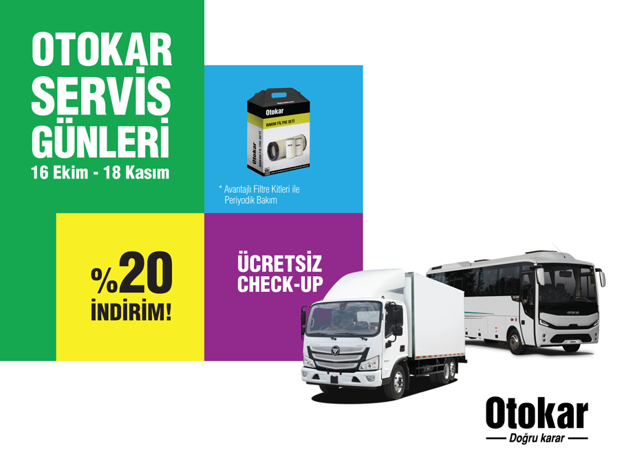 Türkiye genelindeki yaygın servis ağıyla kullanıcısına satış sonrasında düşük bakım giderleri ve uygun parça maliyeti sunarak ticari araç sahiplerinin yükünü her daim hafifleten Otokar'ın kazandıran "Servis Günleri" kampanyası 18 Kasım tarihine kadar devam edecek. Ticari araç sahipleri kampanya kapsamında işçilik, yedek parça, periyodik bakım ve mekanik parçalarda yüzde 20 indirim fırsatından yararlanacak.