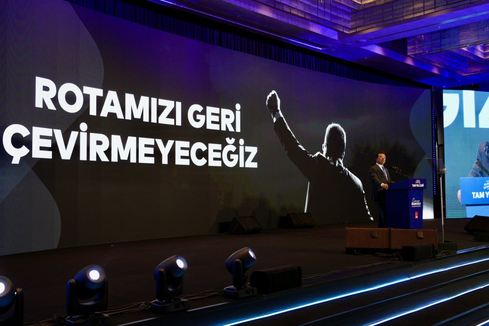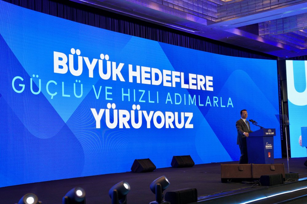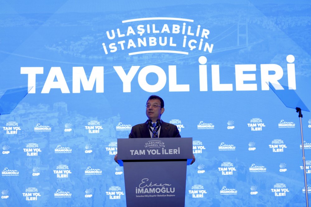 Ulaşımın, İstanbul’un tarihinde her dönem sorun olduğuna dikkat çeken İmamoğlu, “Dönem dönem öyle önemli kişilikler, öyle önemli ağızlar şu dili kullanmıştır: ‘İstanbul'a pasaport koymak lazım. Artık bu şehir kaldırmıyor’ derken aynı kişilikler, şimdi şehre 3-3,5 buçuk milyon daha insan yükü getirecek Kanal İstanbul diye, İstanbul açısından trajedi haline gelen bir projeyi dayatma çabası içerisinde. Böyle bir dünyayla karşı karşıyayız. Ama şükürler olsun, 2019’dan bu yana, iddiayla ifade ediyorum; aklı, bilimi, tekniği, sektör deneyimlerinin, aynı zamanda kurumsal deneyimleri, aynı zamanda sektör bileşenlerinin, minibüsçüsü, otobüsçüsü, taksicisi hiç kimseyi, hiçbir sınıflandırma yapmadan masaya davet edip, masada birlikte tartışıp, çözüm arayan ve o iş birliği içerisinde, sadece en üst seviyede moderatörlük görevini yürüten bir belediye başkanı, bir belediyecilik ve bir belediye yönetimi mevcut. Bu aynı zamanda bu dönemin ‘İstanbul’un muhafızı’ kimliği üzerinden de şehrin görebileceği zararlara karşı son derece üstün, son derece kararlı bir savunma mekanizmasının da sahibidir. Ben sizi bugün, İBB Başkanı ama aynı zamanda CHP İstanbul Büyükşehir Belediye Başkanı adayı ama aynı zamanda güçlü İstanbul İttifakı'nın verdiği görevle, ‘İstanbul muhafızı’ olarak selamlıyorum” dedi.