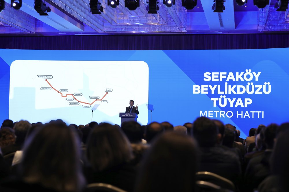 “Çok mutluyum. Çünkü biz, tarihimizin en çok ve en hızlı metro yapan ekibi olduk. Çekmeköy-Sancaktepe-Sultanbeyli metro hattından sonra, Ataköy-İkitelli metro hattımızı da18 Mart Pazartesi günü İstanbulluların hizmetine sunuyoruz. 6 metro hattımızda ise inşaatlarımız hızla devam ediyor. Samandıra-Sultanbeyli, Ümraniye-Ataşehir-Göztepe, Kaynarca-Pendik-Tuzla, Mahmutbey-Bahçeşehir-Esenyurt, Yıldız-Kabataş ve Kirazlı-Halkalı hatlarımızı hızla tamamlayıp, hizmete açacağız. Bunlarla da kalmayacağız. Projesini, finansını hazırladığımız metro hatlarına, önümüzdeki dönem hızla başlayacağız. İşte o hatlar: Yaklaşık 19 kilometre ve 10 istasyondan oluşan, benim de oturduğum yer olan Sefaköy-Beylikdüzü-TÜYAP metro hattı. Ve o tek bir imzayı, 31 Mart'taki atacağımız farka göre hızını göreceğiz. Bir haftada mı imzalanacak? 15 günde mi, 1 ayda mı, 40günde mi? Atacağımız farka göre, imzanın atılacağı gün geri çekilecek. Bundan eminim ben. 2022 Temmuz ayından beri,3 milyon insana hizmeti engelliyor. Biliyorsunuz; 2022 yılının Temmuz ayından bu yana, hattın Cumhurbaşkanlığı Kamu Yatırım Programı’na alınması için 4 defa başvurmamıza rağmen, gerekli imza atılmadı. Tek bir imza! İlk etapta Sefaköy’e kadar olan kısmını açacağımız hattımızın İncirli’ye kadar uzatılmasıyla, metro erişimi olmayan batı bölgesindeki 4 milyonu aşan İstanbulluyu, 2000’li yılların başından beri bekledikleri metrolarına kavuşturmuş olacağız.”