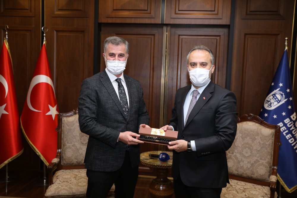 Tüm Özel Halk Otobüsleri Birliği (TÖHOB) Başkanı Ercan Soydaş, yönetim kurumu üyeleriyle birlikte, Büyükşehir Belediyesi’nin otobüsçü esnafına yönelik destekleri nedeniyle Büyükşehir Belediye Başkanı Alinur Aktaş’ı ziyaret etti. Bursa’da toplu ulaşımda esnafa sağlanan destekleri gittikleri bütün illerde örnek olarak anlattıklarını dile getiren Soydaş, “Bu konu biraz da belediye başkanlarının iyi niyetiyle alakalı. Çünkü esnafın sorunlarını bilip, görüp, çözüm üretmek önemli bir maharet. Bursa olarak toplu taşımada hayata geçirdiğiniz modelin yaygınlaşması için gayret ediyoruz. Sorunlarımızı çok iyi biliyorsunuz. Türkiye genelinde çözüm üretilmesi noktasında da desteklerinizi istirham ediyoruz. Bursa’da esnaf arkadaşlarımız mutlu. Bu modelin Türkiye’ye yayılmasını umut ediyoruz” dedi.