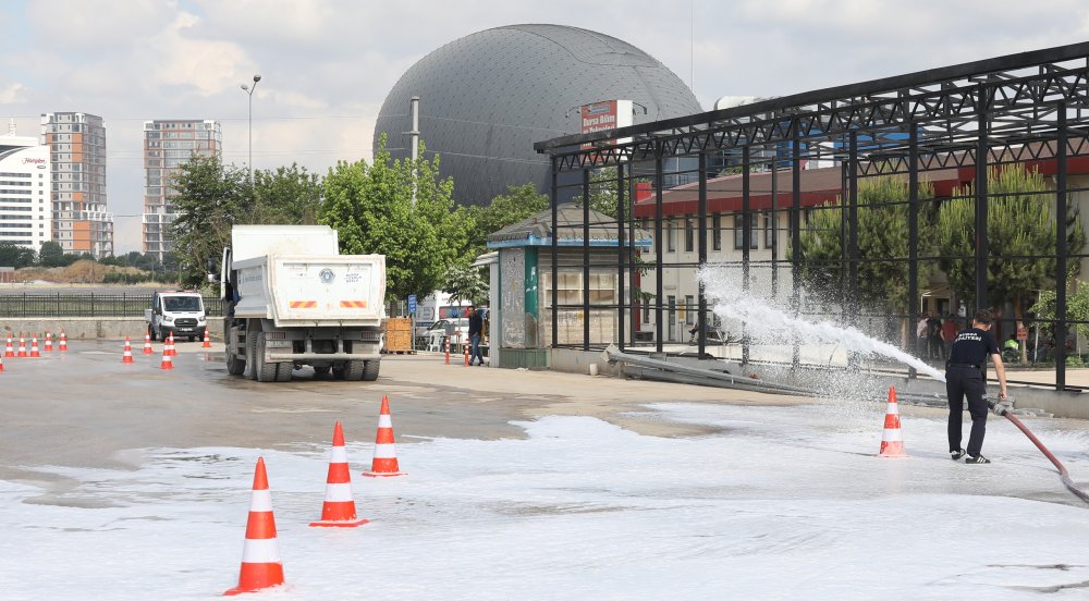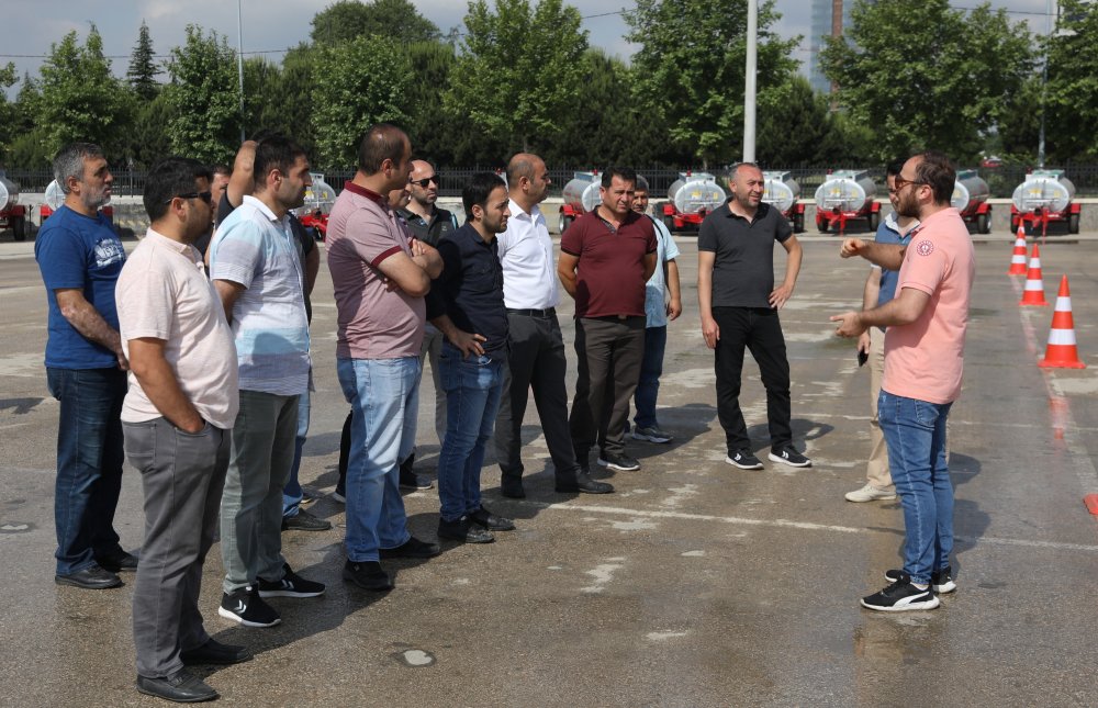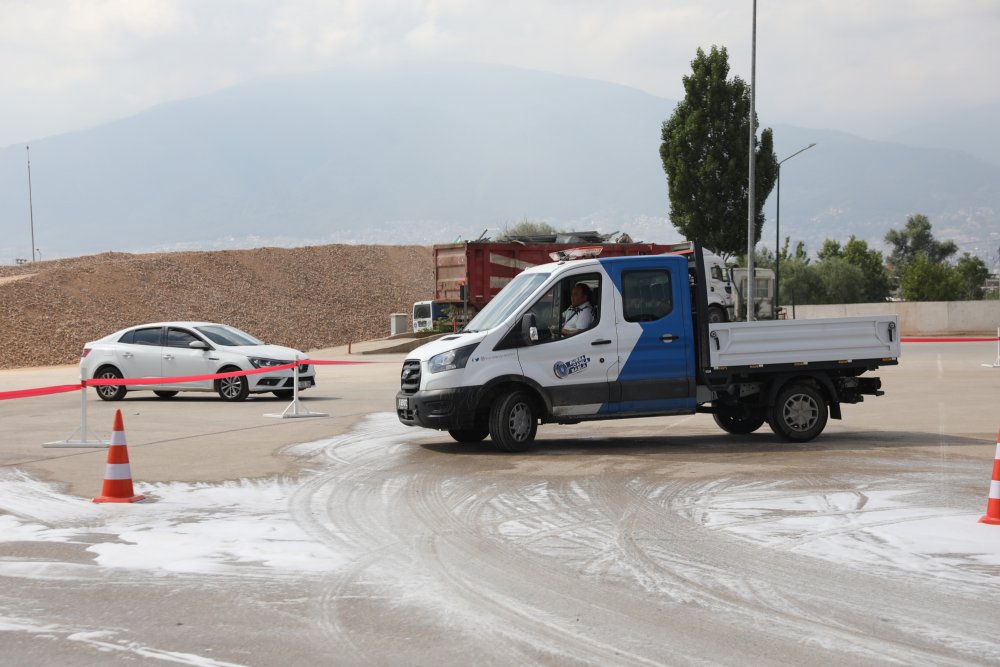 Eğitimin uygulama aşaması ise BUTTİM’deki ek hizmet binası şantiyesinde yapıldı. Eğitim alan şoförler için özel olarak oluşturulan parkur, ilk olarak itfaiye ekipleri tarafından köpüklü suyla kayganlaştırıldı.