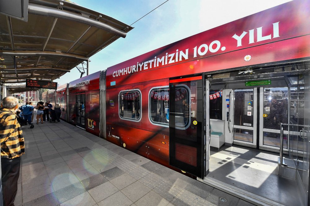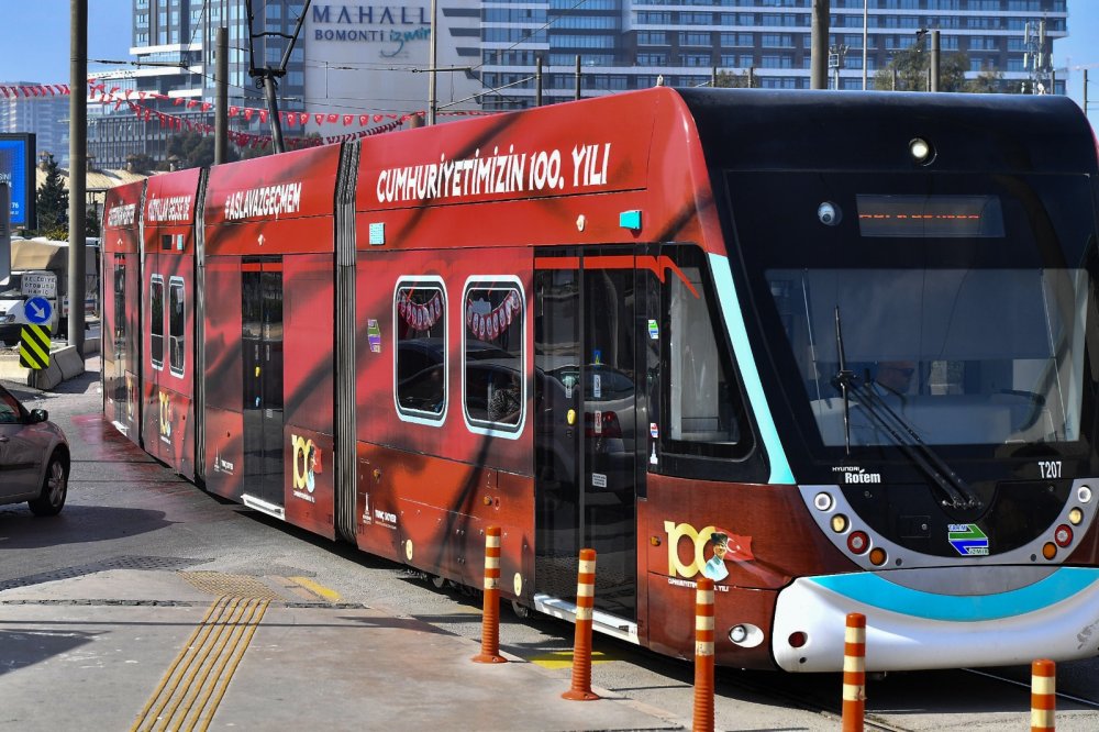 29 Ekim öncesinde cadde ve sokaklarda 35 bin metrekarelik alan bayraklarla kaplandı. 85 bin bayrakla İzmir, kırmızı beyaza büründü. Şehir merkezinden geçen, Fahrettin Altay-Halkapınar hattında iki tramvay aracının dış yüzeyi Cumhuriyet Bayramı temalı görsellerle kaplandı. “Açtığın yolda, gösterdiğin hedefe, yüzyıllar geçse de Asla Vazgeçmem” yazısı ve ulu önder Mustafa Kemal Atatürk’ün yurt gezilerinde kullandığı beyaz trenin camından baktığı canlandırma da tramvay araçlarında yer aldı. İzmirliler tramvaylara yoğun ilgi gösterdi.