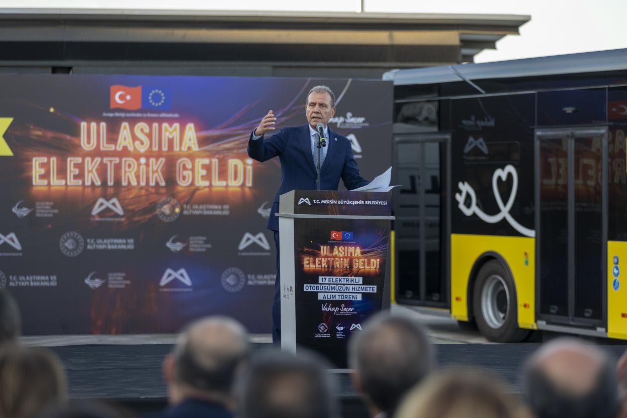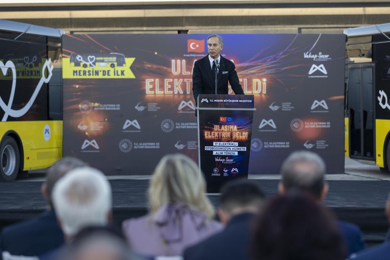 TBB Başkan Vekili ve Mersin Büyükşehir Belediye Başkanı Vahap Seçer törende yaptığı konuşmasında, Büyükşehir’in ulaşımda yarattığı vizyonu hatırlatarak, Mersinlilere çevre dostu toplu taşıma hizmeti sunmak adına göreve geldikleri ilk yıldan itibaren gayret içinde olduklarını söyledi. Mersin’de önceki yıllarda hizmet veren yaş ortalaması yüksek otobüs filosunun yenilendiğini ifade eden Seçer, “O dönemde CNG yakıtlı otobüsler Türkiye’de pek konuşulmazken herhangi bir kredi desteği olmadan, Mersinlilerin ismini ‘Limon’ olarak koyduğu ilk 87 otobüsü almıştık. Daha sonra Avrupa İmar ve Kalkınma Bankası’nın (EBRD) ‘Green City’ kapsamındaki programından yararlanarak 118 yeni otobüs aldık. 205 CNG yakıtlı toplu taşıma araçlarımız şu anda Mersin’de hemşerilerimize hizmet veriyor. Sokakları daha dar olan Tarsus’a daha ekonomik olması ve her sokağa girebilmesi için Karsan’dan 67 adet Atak otobüsler aldık. Başta Tarsuslular olmak üzere kırsal mahallelerde yaşayan vatandaşlarımız şu anda bu otobüslerle seyahat ediyorlar” dedi. 6,5 yıllık görev süresi içerisinde otobüs filosuna 290 yeni nesil otobüs ekleyerek büyük başarı ortaya koyduklarına değinen Seçer, rek, “Mersin’de hem yeni hem çevre dostu yakıt tüketen otobüsler hem de yeni modeller olmasıyla 5 yıl içerisinde bir devrim gerçekleştirdik. Filomuz devreye alacağımız araçlarla beraber 456 araca çıkmış olacak. Mersinlilere hayırlı uğurlu olsun” dedi.