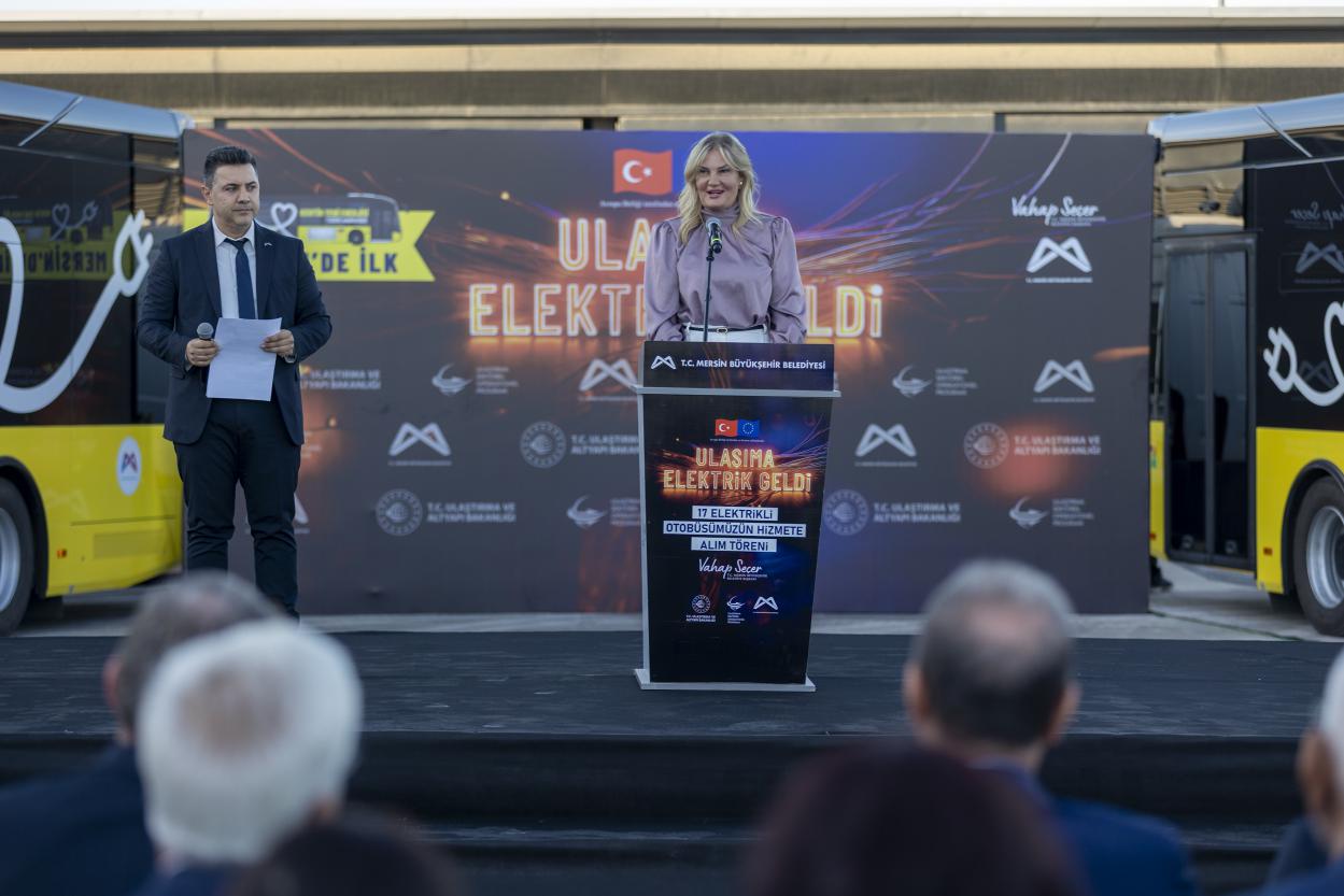 MEŞOT Toplu Taşıma Yerleşkesi’nde gerçekleştirilen törene Başkan Seçer’in yanı sıra; AB Türkiye Delegasyonu İş Birliği Bölüm Başkanı Maria Luisa Wyganowski ve Ulaştırma Sektörü Yöneticisi Dr. Göktuğ Kara, Karsan Ticari Satış Genel Müdür Yardımcısı Muzaffer Arpacıoğlu, CHP Mersin Milletvekilleri Gülcan Kış ile Hasan Ufuk Çakır, Ulaştırma ve Altyapı Bakanlığı, AB ve Karsan yetkilileri, CHP Kadın Kolları MYK Üyesi Hatice Us, CHP Gençlik Kolları Genel Başkan Yardımcıları Çağla Devrim Palamut ile Eren Yücesoy, ilçe belediye başkanları, siyasi partilerin il ve ilçe başkanları, yöneticileri, meclis üyeleri, muhtarlar, Mersin Büyükşehir Belediyesi ve MESKİ bürokratları ile çok sayıda vatandaş katıldı. Saygı duruşunda bulunulması ve İstiklal Marşı’nın okunmasının ardından başlayan törende konuşmalara geçildi.