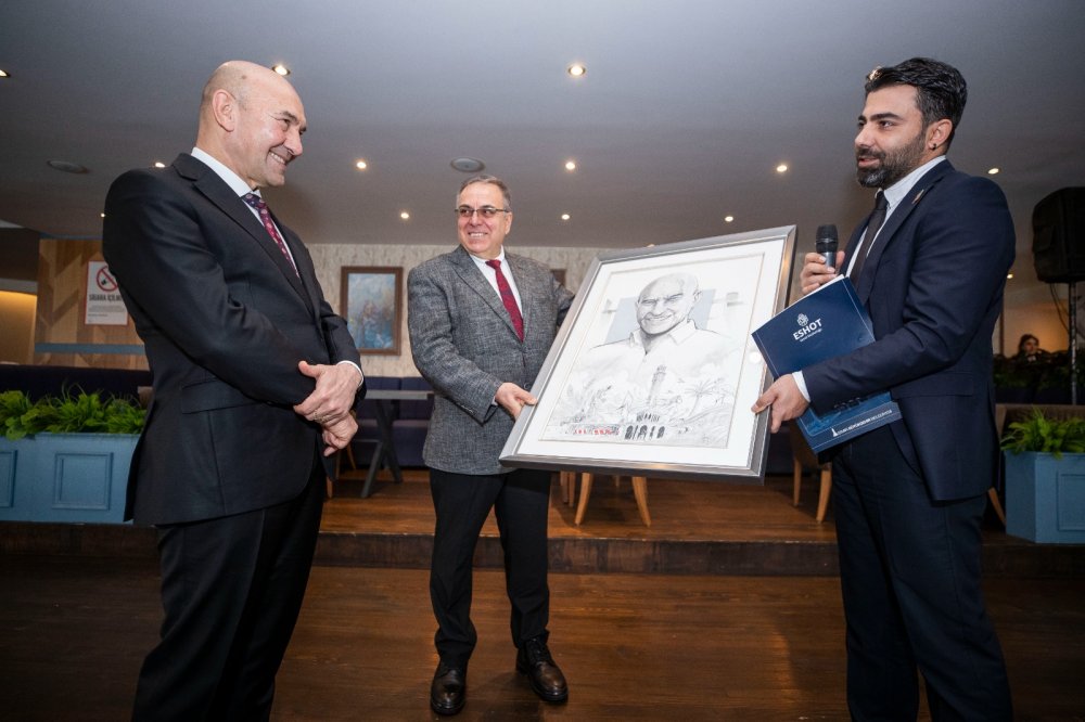 Toplantının ardından Erhan Bey, Başkan Soyer’e ESHOT atölyelerinde üretilen plaket ve ESHOT çalışanı Efe Can Sezer tarafından yapılan portreyi takdim etti.