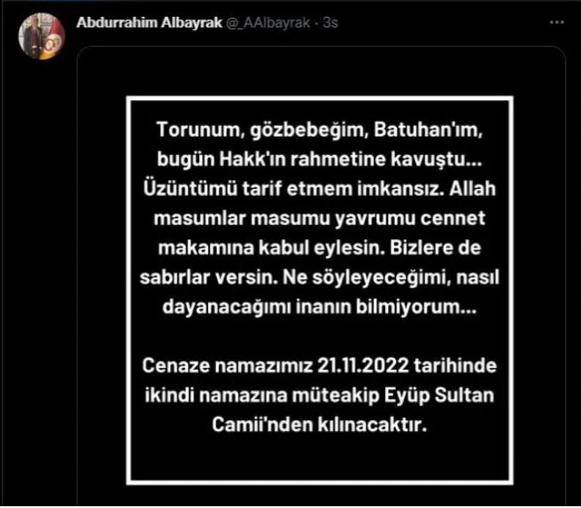 Abdurrahim Albayrak, "Torunum, gözbebeğim, Batuhan'ım, bugün Hakk'ın rahmetine kavuştu. Üzüntümü tarif etmem imkansız. Allah masumlar masumu yavrumu cennet mekanına kabul eylesin. Bizlere de sabırlar versin. Ne söyleyeceğimi, nasıl dayanacağımı inanın bilmiyorum. Cenaze namazımız 21.11.2022 tarihinde ikindi namazına müteakip Eyüp Sultan Camii'nde kılınacaktır" ifadelerine yer verdi.