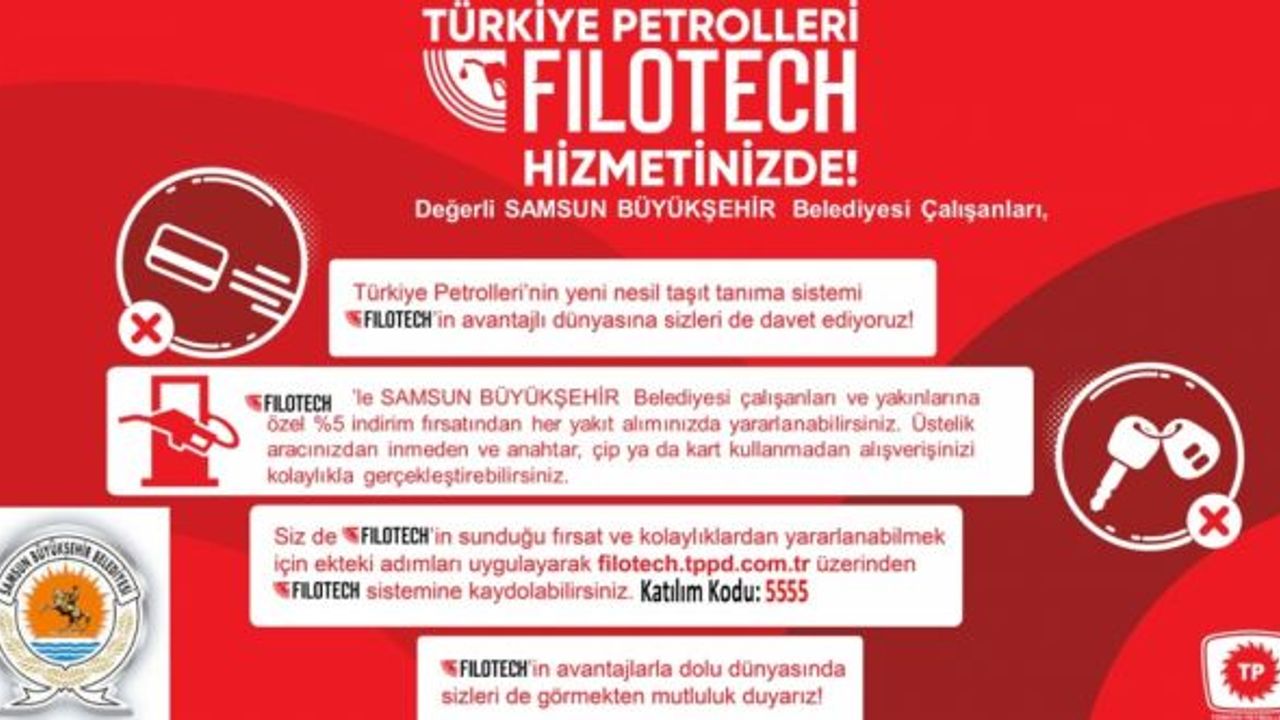 Samsun Büyükşehir Belediyesi ile Türkiye Petrolleri arasında, belediye çalışanlarının akaryakıt alım işlemlerinde avantaj sağlayacak bir iş birliği çalışması yapıldı. Bu kapsamda Büyükşehir Belediyesi ile bağlı kurum ve tüm iştiraklerinin çalışanları ve yakınları Türkiye Petrolleri’nin yeni nesil taşıt tanıma sistemi ‘Fılotech’ ile yaptıkları her akaryakıt alışverişinde yüzde 5 indirime hak kazanacak. Fılotech sistemine ‘fılotech.tppd.com.tr’ adresi üzerinden kayıt olunabilecek. Sistemin aktif olarak kullanımı ile birlikte Türkiye Petrolleri’ne ait akaryakıt istasyonlarından yapılan alışverişlerinde indirim hakkı kullanılabilecek. Ülke genelindeki tüm Türkiye Petrolleri’ne ait akaryakıt istasyonlarında bu indirim geçerli olacak.