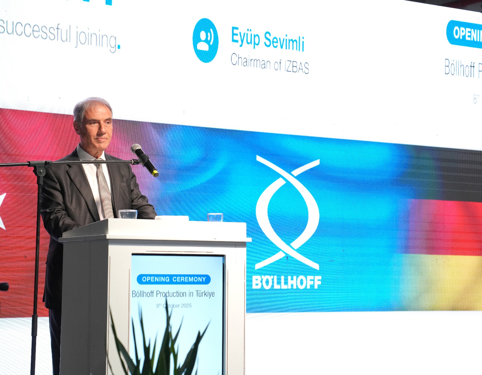 İZBAŞ İzmir Serbest Bölge Kurucu ve İşleticisi A.Ş Yönetim Kurulu Başkanı Eyüp Sevimli, Böllhoff’u yatırımcı kimliği ile Türkiye’ye kazandırmaktan duyduğu mutluluğu dile getirdi.