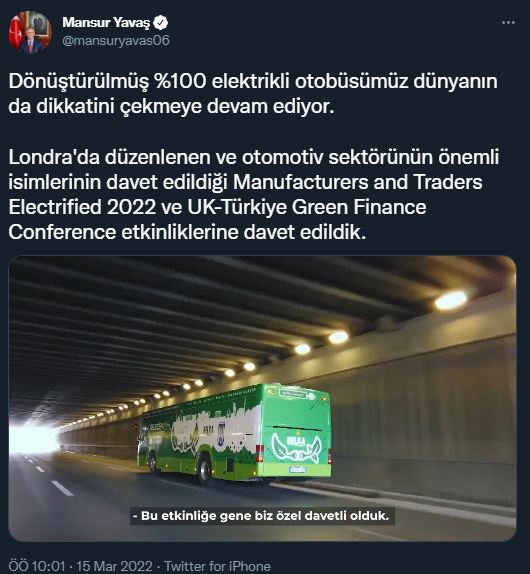 Davet duyurusunu sosyal medya hesapları üzerinden paylaşan Büyükşehir Belediye Başkanı Mansur Yavaş, “Dönüştürülmüş yüzde 100 elektrikli otobüsümüz dünyanın da dikkatini çekmeye devam ediyor. Londra’da düzenlenen ve otomotiv sektörünün önemli isimlerinin davet edildiği Manufacturers and Traders Electrified 2022 ve UK-Türkiye Green Finance Conference etkinliklerine davet edildik” dedi. BELKA AŞ, 17 Mart 2022 tarihinde Londra’da Birleşik Krallık Uluslararası Ticaret Bakanlığı tarafından düzenlenecek ‘UK-Türkiye Green Finance Conference’na (Birleşik Krallık-Türkiye Yeşil Finans Konferansı) davet edildi.