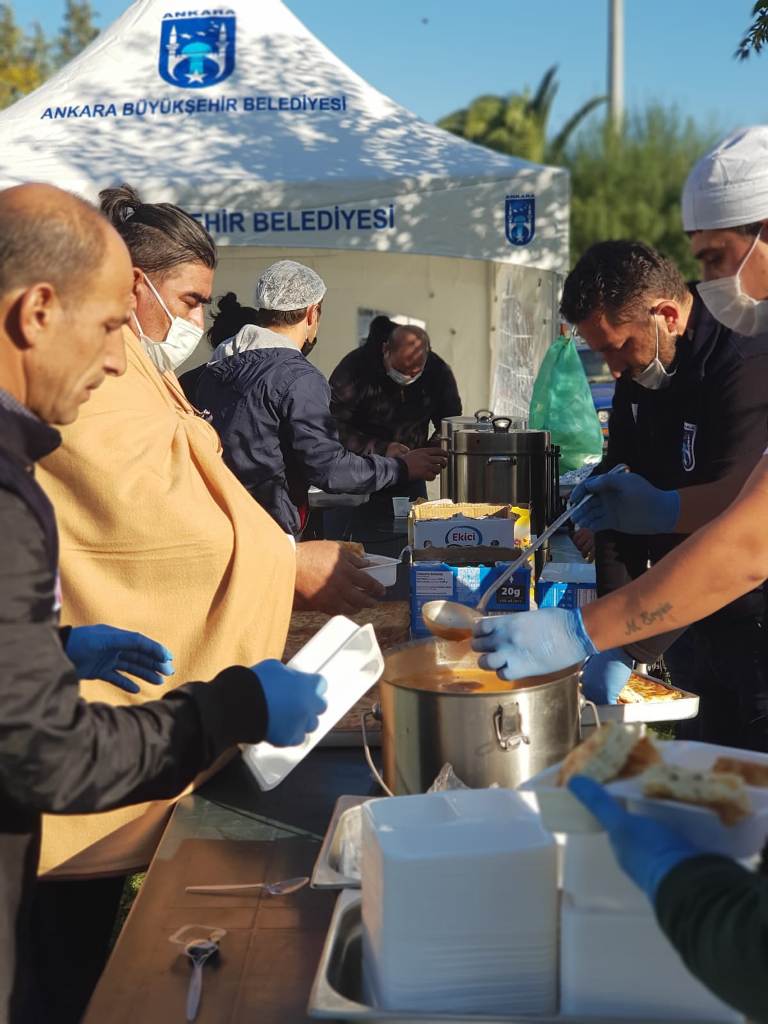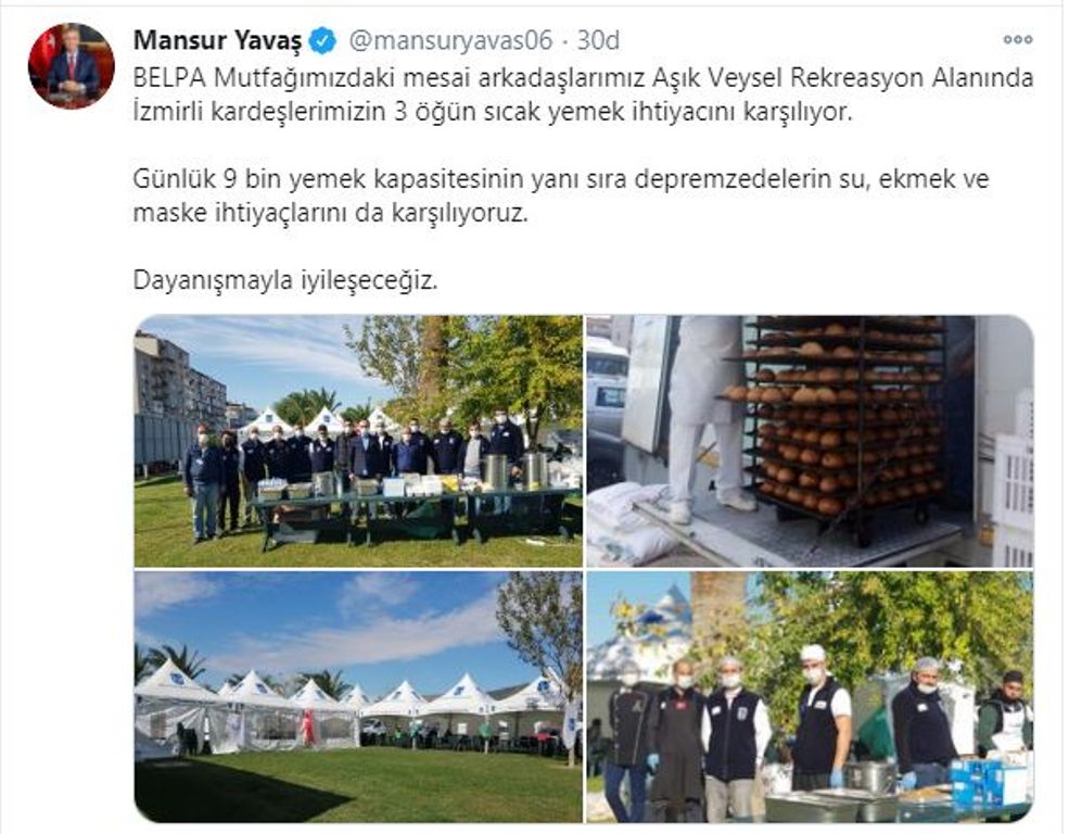 İzmirli vatandaşlara destek olmak için bölgeye giden Başkan Yavaş, yapılan yardımlarla ilgili sosyal medyadan şu paylaşımı yaptı:“BELPA Mutfağımızdaki mesai arkadaşlarımız Aşık Veysel Rekreasyon Alanında İzmirli kardeşlerimizin 3 öğün sıcak yemek ihtiyacını karşılıyor. Günlük 9 bin yemek kapasitesinin yanı sıra depremzedelerin su, ekmek ve maske ihtiyaçlarını da karşılıyoruz. Dayanışmayla iyileşeceğiz. Aynı zamanda vatandaşlarımızın toplanma alanlarına mobil tuvalet yerleştirdik. Depremden etkilenen can dostlarımıza da mama desteğinde bulunuyoruz. İş birliği içerisinde çalışmayı ve tüm imkanlarımızla İzmir’in yanında olmayı sürdüreceğiz.”