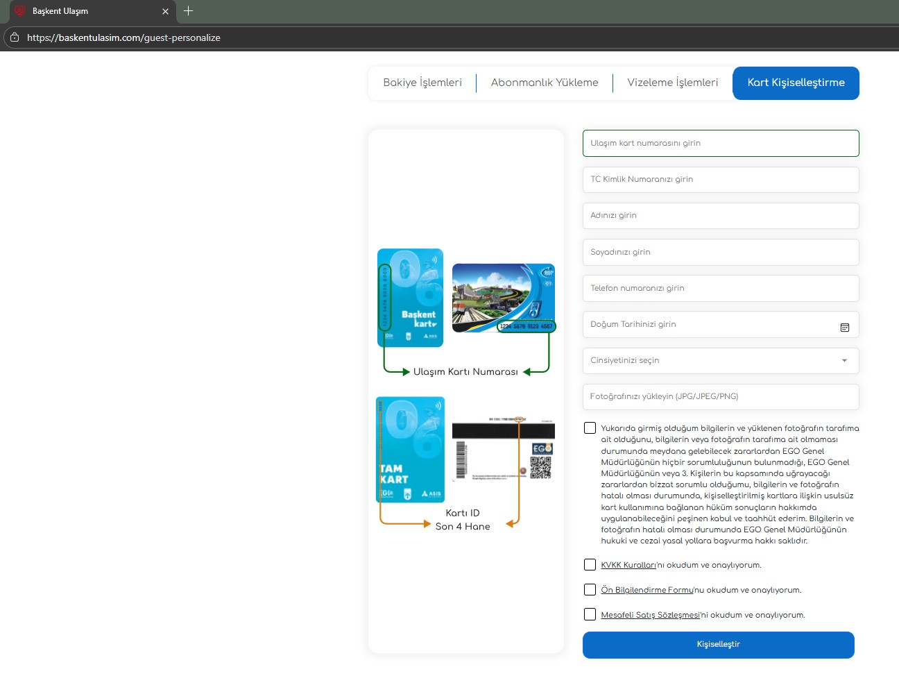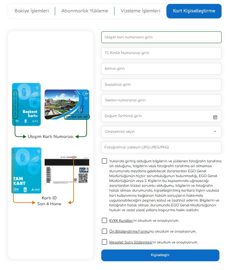 Online kart kişiselleştirme işlemleri, https://baskentulasim.com adresi üzerinden “Kart Kişiselleştirme” sekmesinden gerçekleştirilebiliyor. Uygulama sayesinde anonim kart sahipleri, kartlarını kendilerine özel hâle getirerek hem zaman tasarrufu sağlıyor hem de işlem merkezlerindeki yoğunluğun azaltılmasına katkı sunuyor. Ayrıca kişiselleştirilmiş kart uygulaması sayesinde vatandaşlar, içerisinde bakiye bulunan kartlarını kaybetmeleri durumunda da mağduriyet yaşamıyor. T.C. kimlik numaralarıyla eşleştirilen kartlar sayesinde, kaybolan karttaki bakiye herhangi bir kayıp olmadan yeni alınan kişiselleştirilmiş karta aktarılabiliyor.