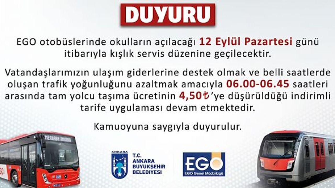 EGO Genel Müdürlüğü toplu taşıma araçlarında, 12 Eylül 2022 Pazartesi günü 2022-2023 eğitim-öğretim yılının başlaması nedeniyle servis planlamasında kışlık program uygulamasına geçiyor.