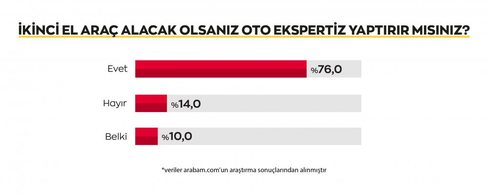 arabam.com’un araştırmasında yer alan ‘Sıfır araç alacak olsanız oto ekspertiz yaptırır mısınız?’ sorusuna katılımcıların yüzde 42’si ‘Evet’ yanıtını verirken yüzde 38’i ‘Hayır’ dedi. Yüzde 20’si ise soruyu ‘Belki/Emin değilim’ şeklinde yanıtladı. ‘İkinci el araç alacak olsanız oto ekspertiz yaptırır mısınız?’ sorusunu katılımcıların yüzde 76’sı ‘Evet’, yüzde 14’ü ‘Hayır’, yüzde 10’u ise Belki/Emin değilim yanıtını verdi. Anketteki ‘Oto ekspertizi nerede yaptırırsınız?’ sorusuna ‘TSE belgeli kurumsal ekspertiz firmalarına giderim’ diyenlerin oranı yüzde 60, ‘En yakın yere giderim’ diyenlerin oranı yüzde 24, ‘Paket içeriği ve fiyatına göre değerlendiririm’ diyenlerin oranı yüzde 12, ‘İnternetteki yorumlara göre giderim’ diyenlerin oranı ise yüzde 5 oldu.