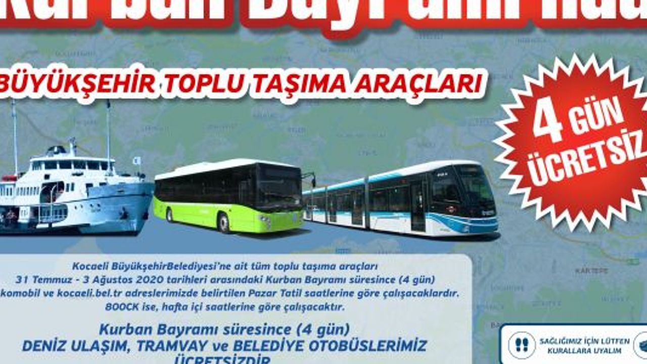Kocaeli Büyükşehir Belediyesi, Kurban Bayramı süresince vatandaşlara ücretsiz ulaşım hizmeti verecek. Bu kapsamda vatandaşlar Kurban Bayramı’nın birinci günü 31 Temmuz Cuma 00.00 ile son günü 3 Ağustos Pazartesi 24.00’e kadar 4 gün boyunca ücretsiz ulaşımdan yararlanabilecek.