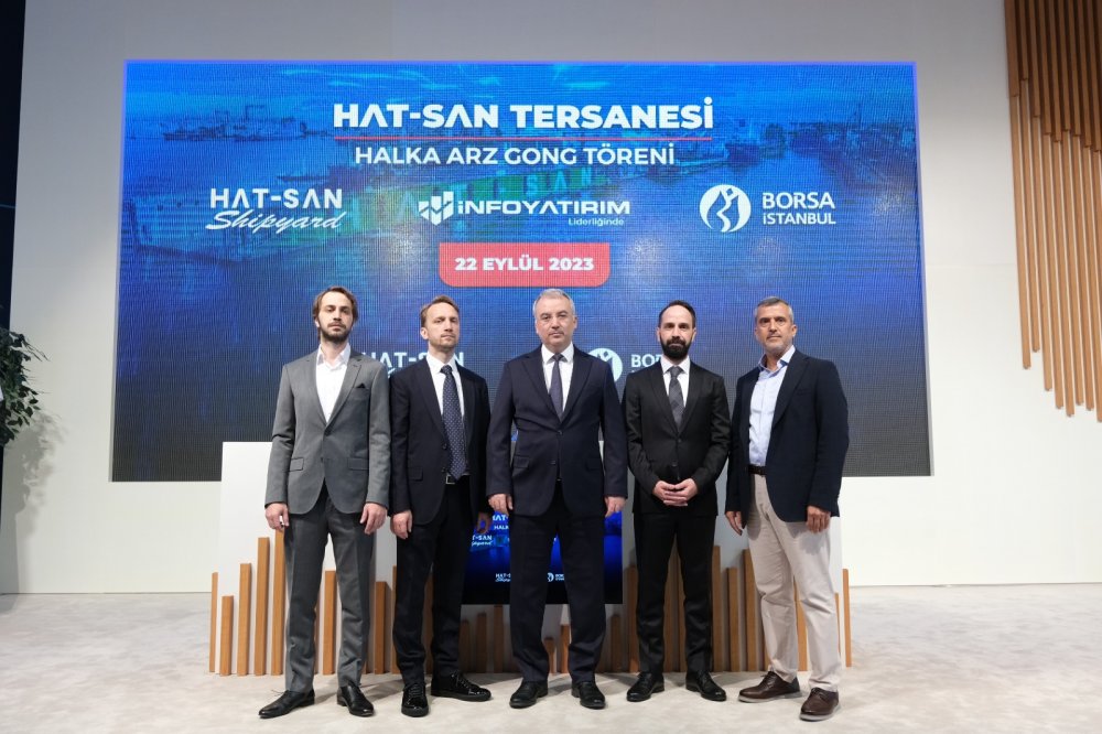 Borsa İstanbul’da düzenlenen Hat-San Tersanesi Halka Arz Gong Töreni, Borsa İstanbul Genel Müdürü Korkmaz Ergun, Hat-San Tersanesi Yönetim Kurulu Başkanı Mehmed Halid İsmail Pepe, Hat-San Tersanesi Yönetim Kurulu Başkan Yardımcısı Mustafa Talha Pepe, Hat-San Tersanesi Yönetim Kurulu Üyesi Mesud Abdurrahman Pepe, İnfo Yatırım Yönetim Kurulu Başkanı Namık Kemal Gökalp, İnfo Yatırım Genel Müdürü Tarkan Akgül ve davetlilerin katılımıyla gerçekleşti.