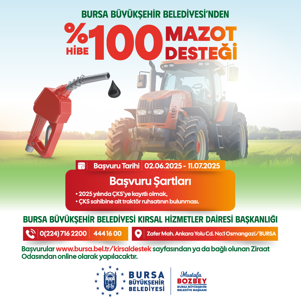 Damla Sulama Boru Üretim Tesisi’nde yüzde 100 geri dönüşüm malzemelerinden üretilen damla sulama borularını üreticilerle buluşturan, Sıvı Gübre Tesisi'nde üretilen sıvı gübreleri çiftçilere teslim eden Büyükşehir Belediyesi, 2 Haziran Pazartesi günü itibariyle mazotla ilgili talepleri de almaya başladı. Başvurular, 11 Temmuz 2025 tarihine kadar www.bursa.bel.tr/kirsaldestek sayfasından ya da bağlı olunan ziraat odasından online olarak yapılacak.