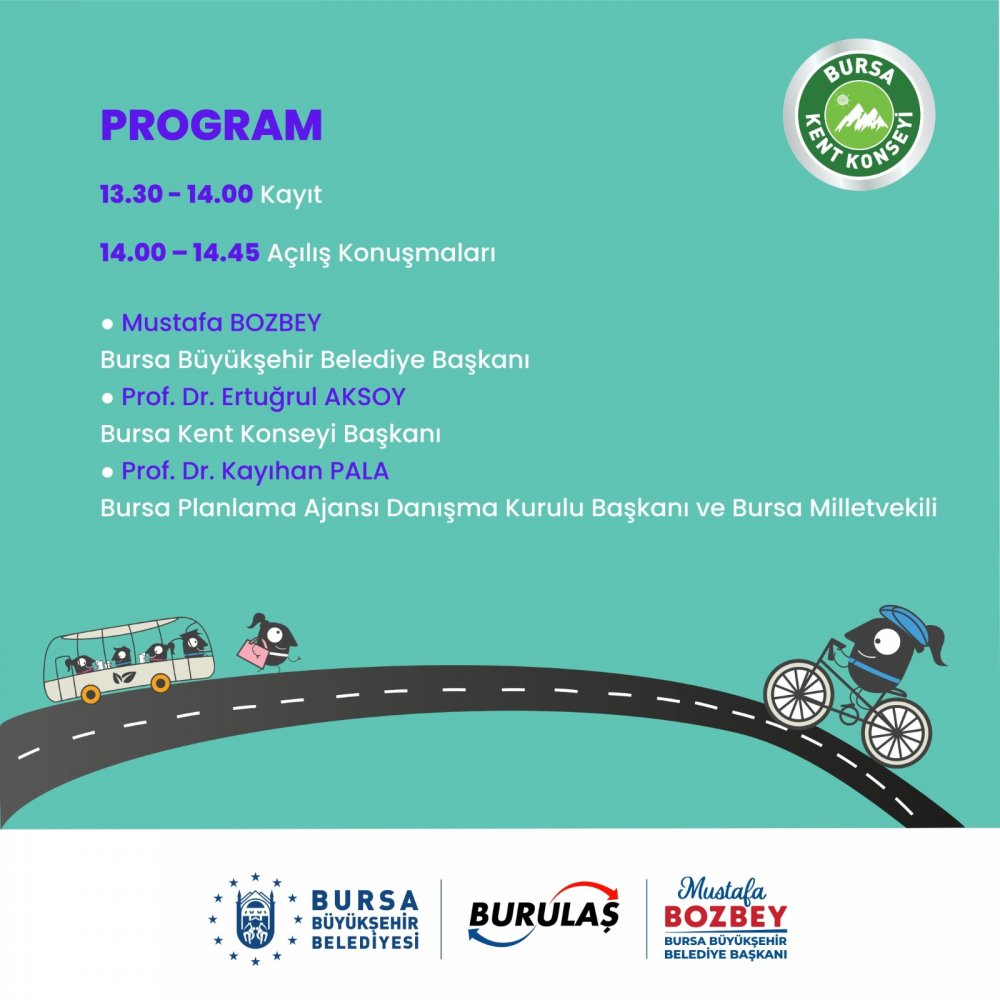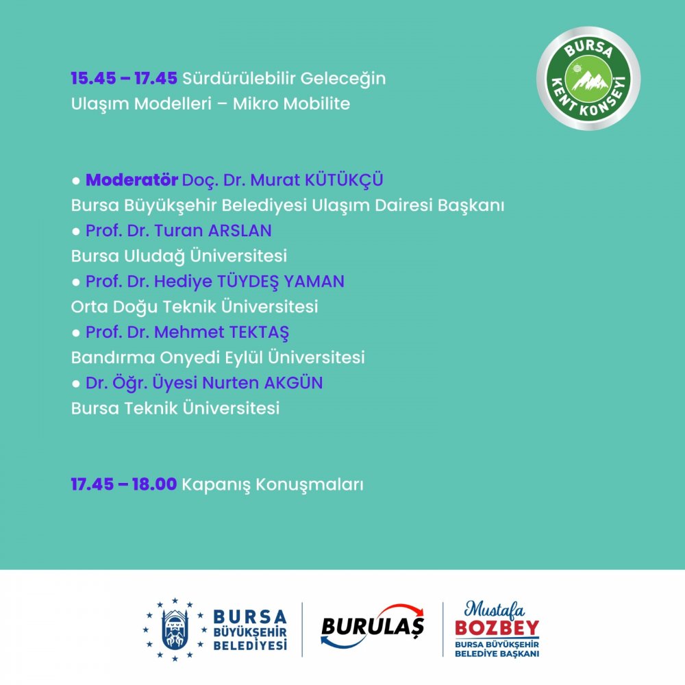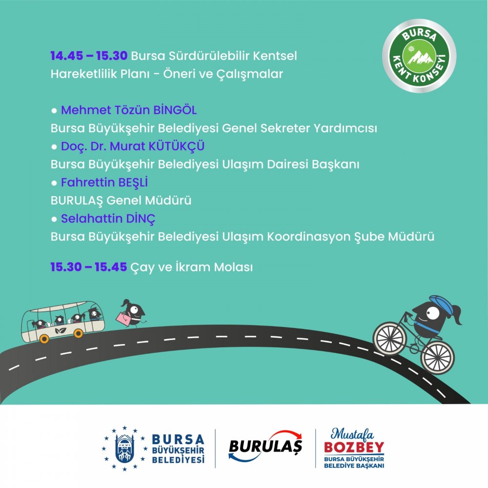 ‘Bursa Sürdürülebilir Kentsel Hareketlilik Planı-Öneri ve Çalışmalar’ konulu oturumda, Bursa Büyükşehir Belediyesi Genel Sekreter Yardımcısı Mehmet Tözün, Bingöl, Büyükşehir Belediyesi Ulaşım Dairesi Başkanı Doç. Dr. Murat Kütükçü, BURULAŞ Genel Müdürü Fahrettin Beşli ve Ulaşım Koordinasyon Şube Müdürü Selahattin Dinç konuşma yapacak.