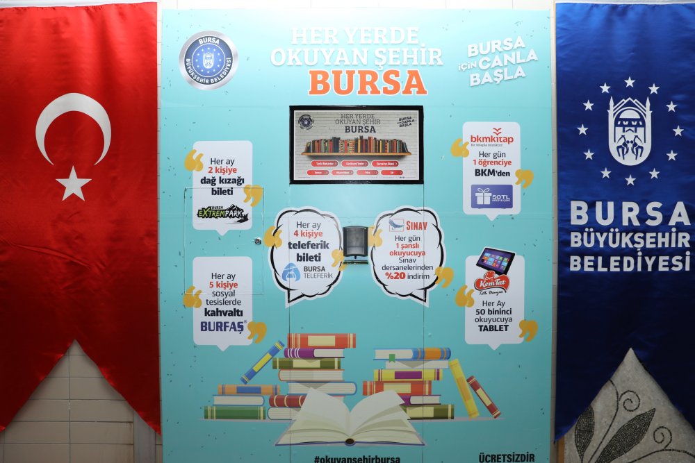 Bursa Büyükşehir Belediyesi, toplu ulaşımın adeta bel kemiği olan Bursaray’ı kullananların Bursa temalı okuma kartlarıyla bilgilendirilmesi ve okuma oranlarının arttırılması amacıyla ‘Her yerde okuyan Bursa’ projesini hayata geçirdi. Arabayatağı, Şehreküstü, Osmangazi, Organize Sanayi ve Üniversite istasyonlarına yerleştirilen okuma kiosklarıyla Bursa’nın tarihi mekânları, gezilecek yerler, Bursa’nın ilkleri, roman, hikâye-masal, fıkra ve şiir gibi konularda bilgiye ulaşacak olan Bursalılar, aynı zamanda farklı hediyeler de kazanma fırsatı bulacak. Proje kapsamında her ay 2 kişiye Extrem Park’ta dağ kızağı bileti, her ay 4 kişiye Teleferik bileti, her ay 5 kişiye Burfaş sosyal tesislerinde kahvaltı, her gün 1 okuyucuya Sınav Dershaneleri’nden yüzde 20 indirim, her gün 1 öğrenciye BKM’de 50 TL hediye çeki ve her ay 50 bininci okuyucuya Kemtat’tan tablet hediye edilecek.