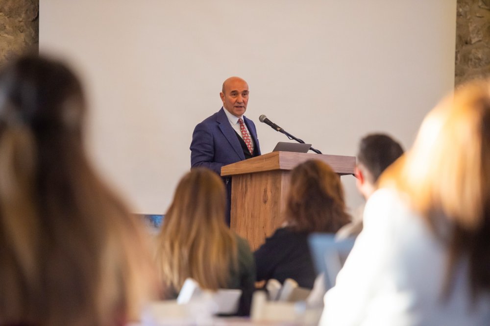 Çalıştayın açılışında konuşan İzmir Büyükşehir Belediye Başkanı Tunç Soyer, dünyadaki krizler derinleşirken turizmin anlam ve değerinin giderek daha da anlaşılmaya başladığını söyledi. Küresel barışı sürdürülebilir hale getirecek en önemli sektörün turizm olduğuna dikkat çeken Soyer, “11 il Türkiye’deki turizm potansiyelinin yaklaşık yüzde 70’ine ev sahipliği yapıyor. Sorumluluğu oldukça ağır ve kıymetli. Turizm öyle bir sektör ki sadece ticaret, ekonomik sektör değil. Aynı zamanda barış kültür alışverişi ve iletişim demek. Küresel barışı sürdürebilir hale getirecek en önemli sektör turizm. İnsanların birbiriyle kültürel alışverişi, keşifleriyle ortaya çıkan anlayış, kültürlere saygı, kavrayış, lezzetlerle, tarihlerle tanışma… Bunların hepsi turizmin bünyesinde olan işler. Bunlar geleceğe dair umut taşımaya imkan veriyor. Yaptığımız iş sadece ticari hacmi büyütmekle ilgili değil. Aynı zamanda küresel barışa hizmet edecek bir çalışma turizm. Öncelikli hedeflerinden biri en yakınından başlayarak büyütmeye dair bir hedef. Önce komşularınız, ondan sonra daha geniş bir halka, daha sonra daha büyük bir halka. İlk hedef en yakınlarınızı kente davet etmeyle ilgili. Turizmin giderek son yıllarda daha fazla öne çıkan iki özelliği, yerelleşme ve dijitalleşme. Geleceği de şekillendirecek iki başlık olarak gözüküyor. Turizmin sektörel olarak büyümesinin yolu da bu iki başlıktan geçiyor. Yerel özelliklerinizi daha fazla gün ışığına çıkartmak, bunları daha fazla görünür hale getirmek ve aynı zamanda teknolojiyi bütün bunlarla daha fazla buluşturmak. Yani dijital erişimi kolaylaştırmak. Daha fazla bu iki başlıkta kafa yormak gerekiyor” dedi.