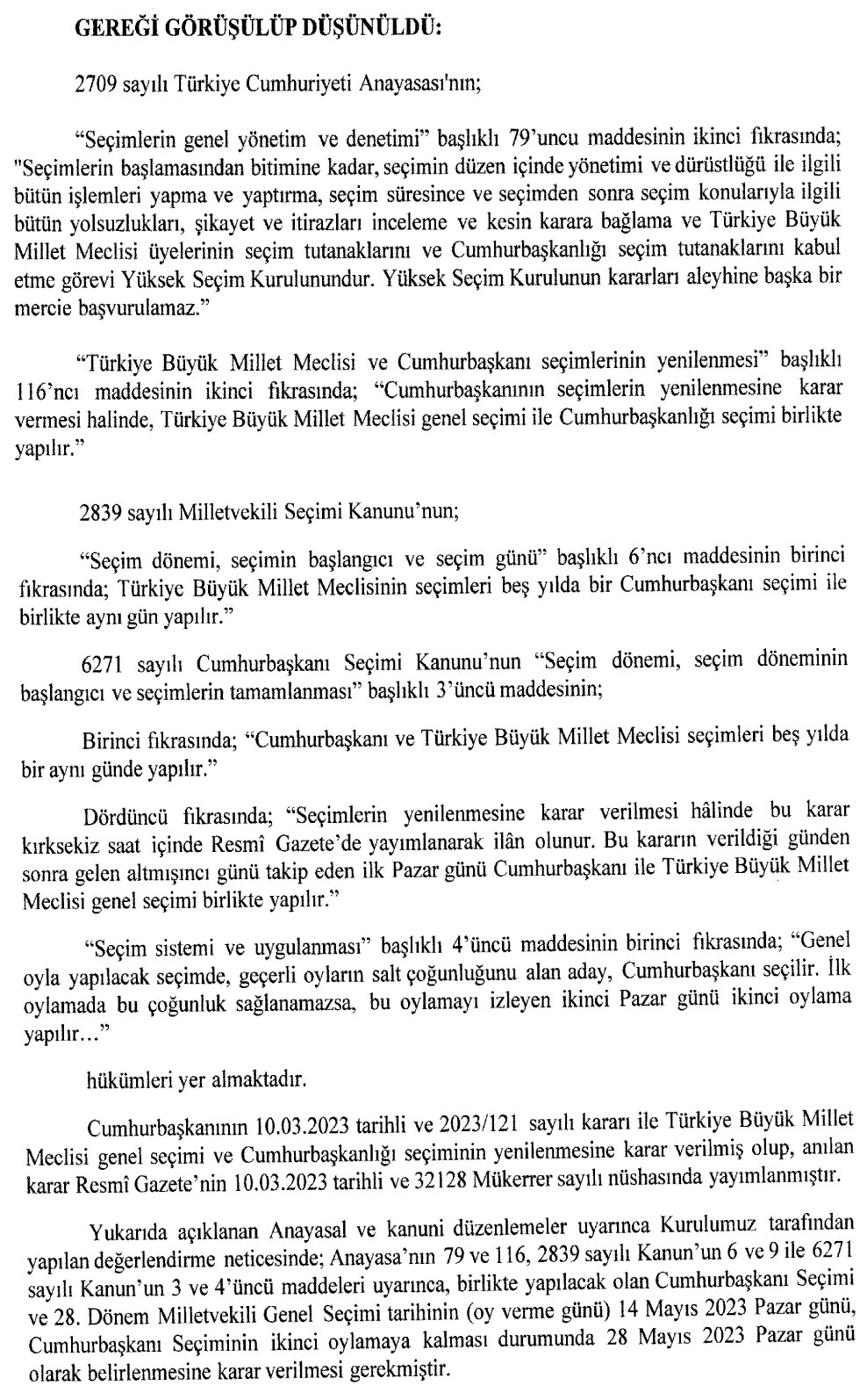 Cumhurbaşkanı Recep Tayyip Erdoğan, Beştepe'de seçim kararını imzaladı. Resmi Gazete'nin mükerrer sayısında seçim kararı yayınlandı. Yüksek Seçim Kurulu Başkanı Ahmer Yener konuyla ilgili olarak yaptığı açıklamada, "Yüksek Seçim Kurulumuz yapmış olduğu toplantıda 14 Mayıs'ta Cumhurbaşkanlığı ve 28. Dönem Milletvekilliği seçimlerinin yapılma tarihi olarak belirlemiştir. Anayasa uyarınca Cumhurbaşkanlığı seçimin ikinci tura kalması halinde de seçim tarihi olarak 28 Mayıs 2023 tarihi belirlenmiştir. 14 Mayıs'ta yapılacak olan milletvekilliği seçiminde, kamu görevlilerinin istifasına yönelik süreç bugün başlanmış olup 16 Mart Perşembe günü saat 17.00'da sona erecektir" dedi