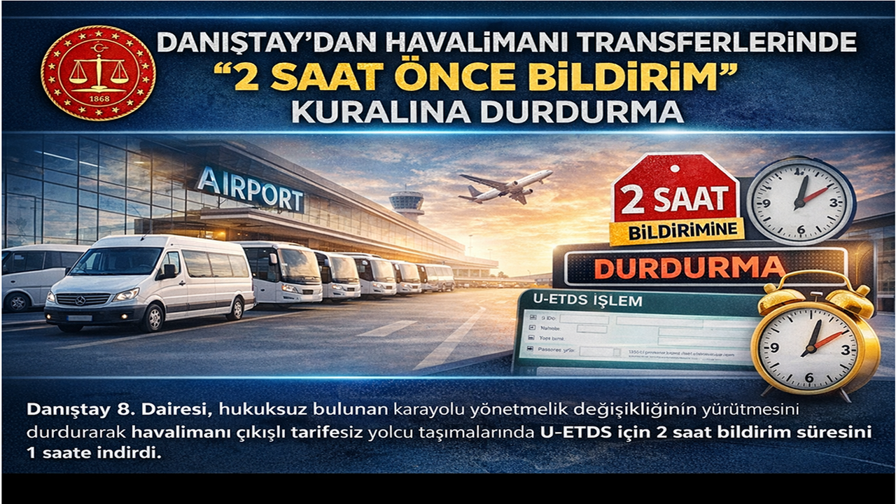 Danıştay 8. Dairesi, Karayolu Taşıma Yönetmeliği’nde yapılan değişiklikle getirilen havalimanından başlayan tarifesiz yolcu taşımalarında U-ETDS’ye en az 2 saat önce bildirim zorunluluğunun yürütmesini durdurdu. Kararla birlikte söz konusu taşımalarda yeniden 1 saatlik bildirim süresi geçerli hale geldi.