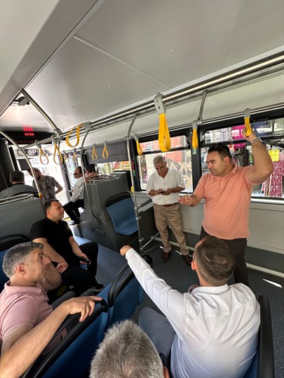 Toplu ulaşım alanında çevreci ve yenilikçi adımlar atmaya devam eden Denizli Büyükşehir Belediyesi Ulaşım A.Ş., Merkezefendi ve Pamukkale ilçelerinde görev yapan mahalle muhtarlarıyla bir araya gelerek, şehir içi ulaşımın mevcut durumu ve geleceği üzerine toplantı gerçekleştirdi. Toplantının ardından, Denizli Büyükşehir Belediye Başkanı Bülent Nuri Çavuşoğlu’nun öncülüğünde ulaşımda dönüşüm hedefiyle hayata geçirilmesi planlanan elektrikli otobüslerin test sürüşü gerçekleştirildi. Test sürüşüne katılan muhtarlar, yeni nesil çevreci ulaşım aracını yakından inceleme ve deneyimleme fırsatı buldu. Ulaşım A.Ş. Genel Müdürü Mehmet Ertuğrul Gökce, test sürüşü sırasında muhtarların ulaşım hizmetlerine dair görüş ve önerilerini dinledi.