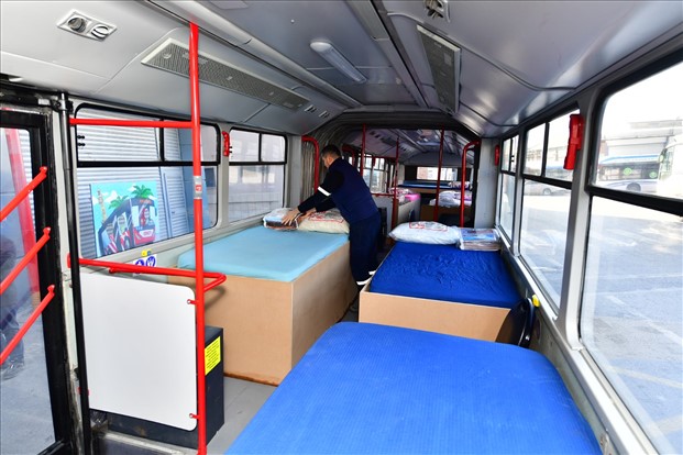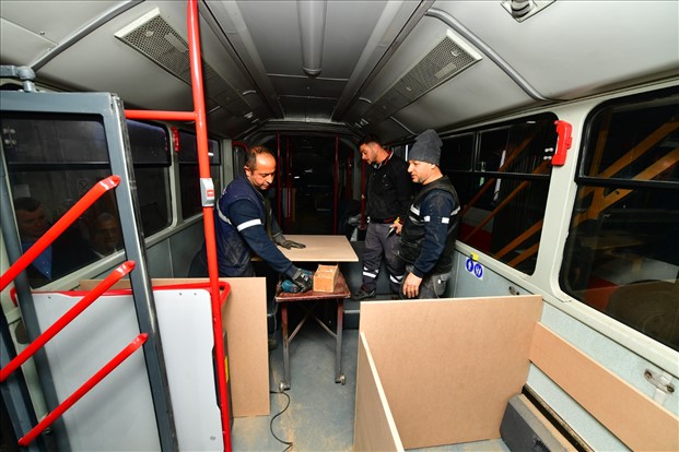 Depremin yaralarını sarmak için tüm birimlerini teyakkuza geçirerek bölgede koordinasyon birimleri kuran İzmir Büyükşehir Belediyesi, ESHOT Genel Müdürlüğü tarafından hazırlanan gezici barınma araçlarını afet bölgesine gönderdi. ESHOT bünyesinde hizmet veren 10 körüklü otobüsün dönüşümü için Gediz Atölyesi’nde çalışma başlatıldı. ESHOT ekipleri otobüslerin koltuk aksamlarını sökerek gezici bir yatakhaneye çevirdi. ESHOT marangozhanelerinde imal edilen yataklar araçlara monte edildi.