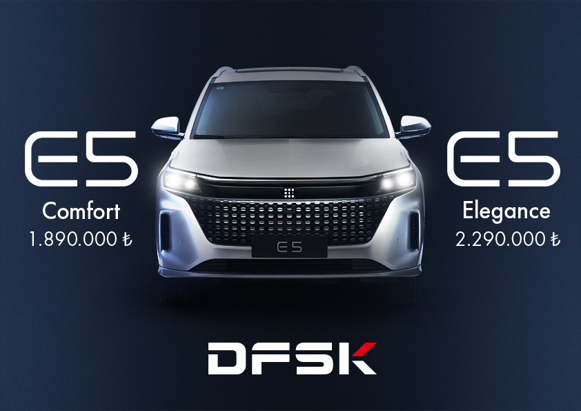 DFSK, yeni SUV modeli E5’i Türkiye’de Comfort ve Elegance olmak üzere iki farklı seviyeyle sunuyor. Her ikisi de zengin donanımlarıyla dikkat çeken 1.890.000 TL’den sunulan DFSK E5 Comfort ve 2.290.000 TL’den sunulan DFSK E5 Elegance, yüksek standartlarıyla dikkat çekiyor.DFSK E5’in siyah iç tasarımı hakim olduğu giriş seviyesi modeli Comfort donanımında, Sunroof, LED aydınlatmalı E logosu, LED ön-arka farlar, LED gündüz farları, elektrikli ayarlanabilir sürücü ve ön yolcu koltuğu, ısıtmalı ve havalandırmalı ön koltuklar, 12.3 inç dokunmatik multimedya ekranı ve dijital sürücü göstergeleri, Apple ve Android akıllı telefon bağlantı özellikleri ve deri koltuk döşemeleri standart olarak yer alıyor.E5’in ürün gamının en üzerinde yer alan ve bej iç tasarımıyla dikkat çeken Elegance donanımı ise, Comfort donanımına ek olarak 360 Derece Panoramik HD Çevre Görüş Kamerası, Elektrikli Bagaj Kapağı, 12 Hoparlör Ses Sistemi, Panoramik Açılabilir Cam Tavanı, 19 inç Alüminyum Alaşımlı Sürtünme Önleyici Özellikli Jantları, Perde Hava Yastıkları, Negatif iyon teknolojisiyle havayı temizleyen Otomatik Klima, Kablosuz Şarj ve daha gelişmiş güvenlik/sürücü asistanı sistemleriyle dikkat çekiyor.