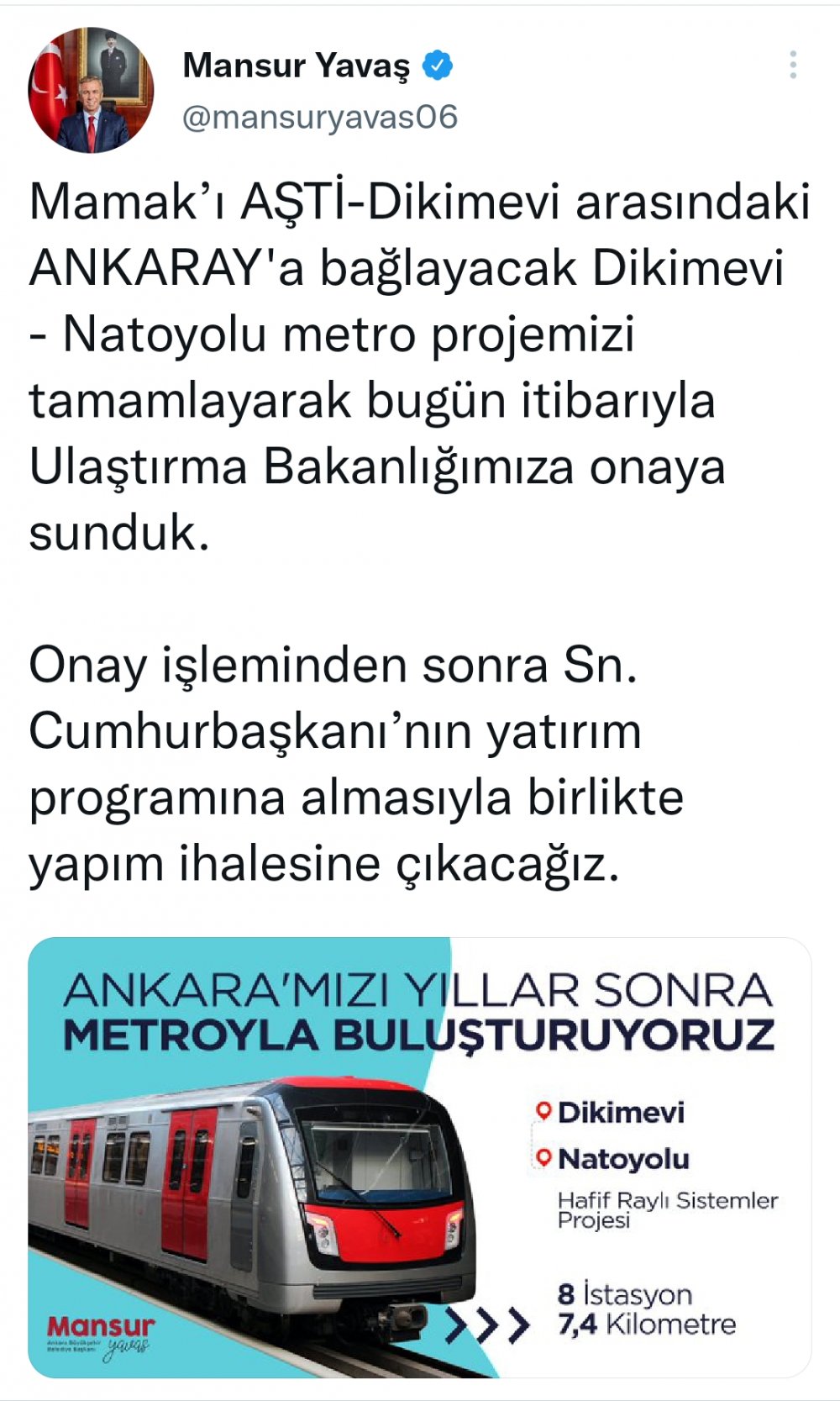 “Mamak’ı AŞTİ-Dikimevi arasındaki ANKARAY’a bağlayacak Dikimevi-Natoyolu metro projemizi tamamlayarak bugün itibarıyla Ulaştırma Bakanlığına sunduk. Onay işleminden sonra Sn. Cumhurbaşkanı’nın yatırım programına almasıyla birlikte yapım ihalesine çıkacağız. Tamamen yeraltından yapılacak olan metro hattının projelerinin Bakanlık tarafından onaylanmasını takiben Ankara Büyükşehir Belediyesinden proje için Cumhurbaşkanlığı Strateji ve Bütçe Başkanlığına yatırım başvurusu yapılacak. Yatırım başvurusunun onaylanmasının hemen ardından ise yapım ihalesine çıkılacak. Ankara Şehirlerarası Terminal İşletmesi (AŞTİ) ile Dikimevi arasında çalışan ANKARAY hattına entegre edilecek olan Dikimevi-Natoyolu hattının uzunluğu 7,4 kilometre olacak. Hat Abidinpaşa, Aşık Veysel, Tuzluçayır, General Zeki Doğan, Fahri Korutürk, Cengizhan, Akşemsettin ve Natoyolu isimleriyle 8 ayrı istasyondan oluşacak. 2026 yılı için zirve saatlerde tek yönde 10.874 yolcunun seyahat edeceği tahmin edilen raylı sistem hattını 2050 yılı için günde 691,528 yolcunun kullanacağı öngörülüyor. Ankara Büyükşehir Belediyesi, Kızılay-Dikmen Metro Hattı için de proje ihalesine çıkılmadan önceki son çalışmalarını sürdürüyor.
