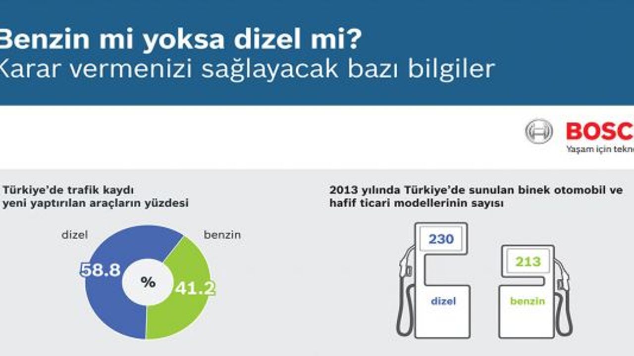 Türkiye’de trafik kaydı yeni yapılan araçlara bakıldığında, araçların yüzde 58,8’inin dizel, yüzde 41,2’sinin benzinli olduğu görülüyor. 2013 yılında, Türkiye’de piyasaya sunulan binek otomobil ve hafif ticari modellerin sayısı ise, dizelde 230, benzinlide 213 olarak tespit edildi.