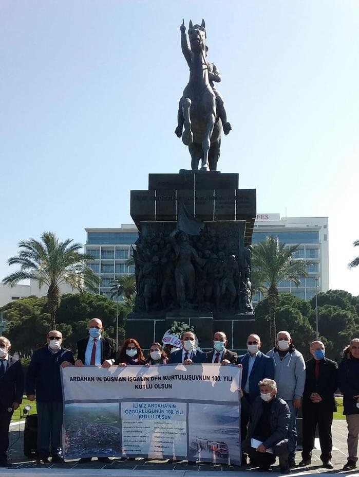 İzmir'de bulunan Ardahan İl, ilçe ve yöre dernek başkanları ve yönetim kurulu üyeleri bugün Cumhuriyet meydanında bulunan Atatürk anıtına çelenk koyarak Ardahan’ın düşman işgalinden kurtuluşunun 100.ncü yılı kutlandı.