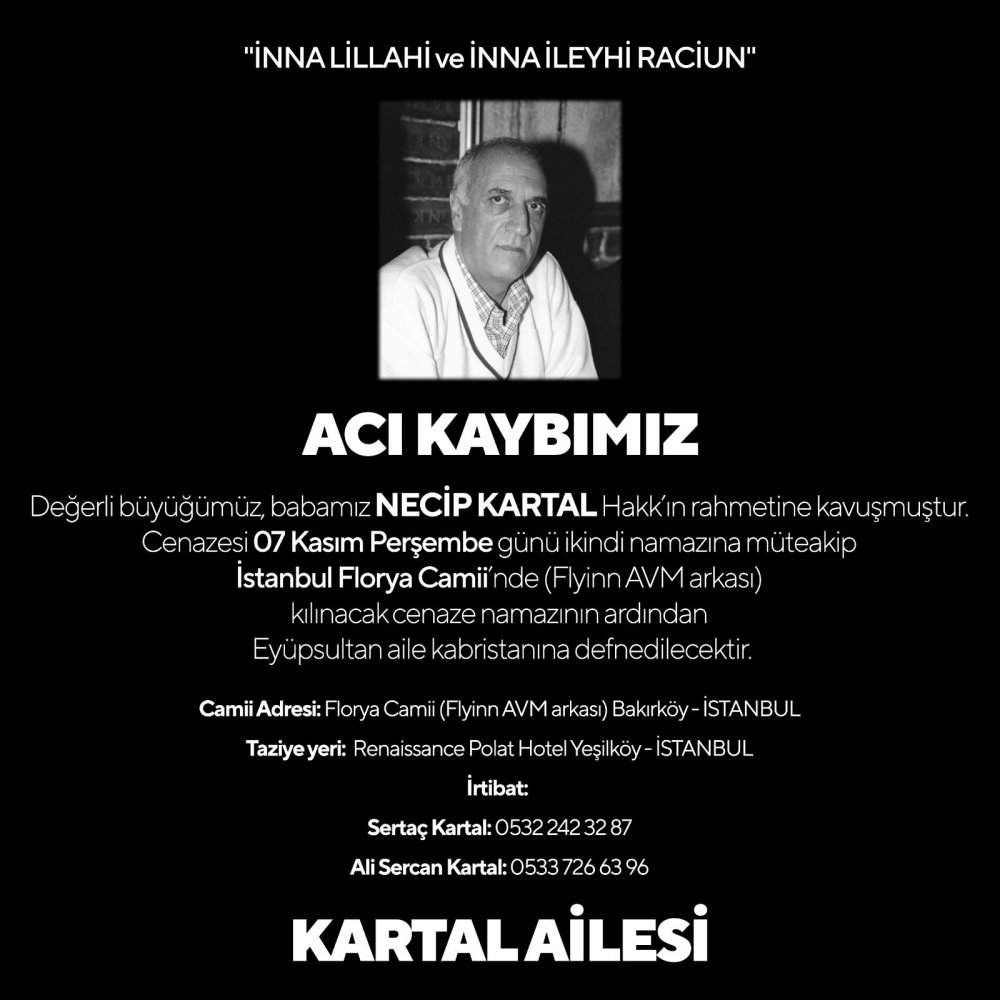 Sektörün en önde gelen duayen isimleri arasında yer alan Necip Kartal, 7 Kasım 2024 tarihinde İstanbul Florya Camii (Flyinn AVM arkası)'nde ikindi namazına müteakip kılınan cenaze namazının ardırdan Eyüp Sultan Aile Kabristanı’na defnedilecek.