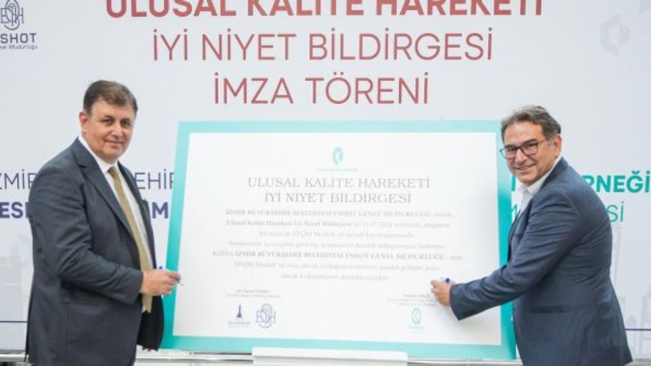 İzmir Büyükşehir Belediyesi, toplu taşımanın can damarlarından ESHOT Genel Müdürlüğü’nün verimliliğini artırma, toplu ulaşım konforunu yükseltme, kurumun ve çalışanların çağın koşullarına göre yenilenip gelişmesini sağlama hedefiyle Türkiye Kalite Derneği (KalDer) İzmir Şubesi ile Ulusal Kalite Hareketi İyi Niyet Bildirgesi’ni imzaladı. Fuar İzmir C Holü Fuaye Alanı’nda düzenlenen törene, İzmir Büyükşehir Belediye Başkanı Dr. Cemil Tugay ile KalDer İzmir Şubesi Yönetim Kurulu Başkanı Hakan Ünlü, İzmir Büyükşehir Belediyesi Genel Sekreteri Barış Karcı, ESHOT Genel Müdürü Turgay Bozoğlu, İZFAŞ Genel Müdürü Canan Karaosmanoğlu Alıcı ile belediye bürokratları ve kurum çalışanları katıldı.