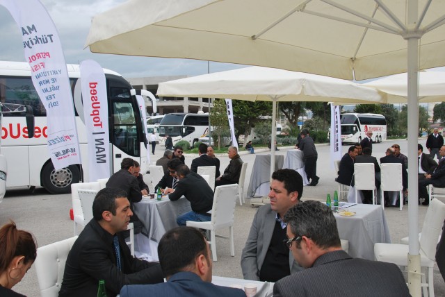 MAN TopUsed Satış Müdürü Cüneyt Ergün, Man Finans Satış Müdürü Mehmet Kılıç, roadshow ekibi, İzmir Bayisi Şensan Otomotiv Bayi yetkililileri müşterilerle bir araya geldiler.