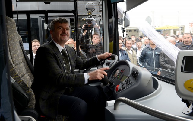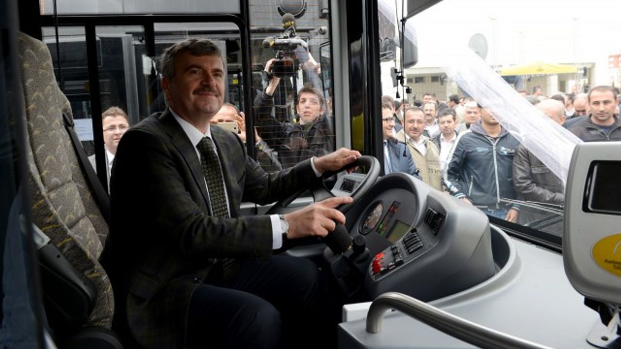 Büyükşehir Belediye Başkanı Tahir Akyürek, şoför koltuğuna geçerek yeni otobüsleri inceledi.