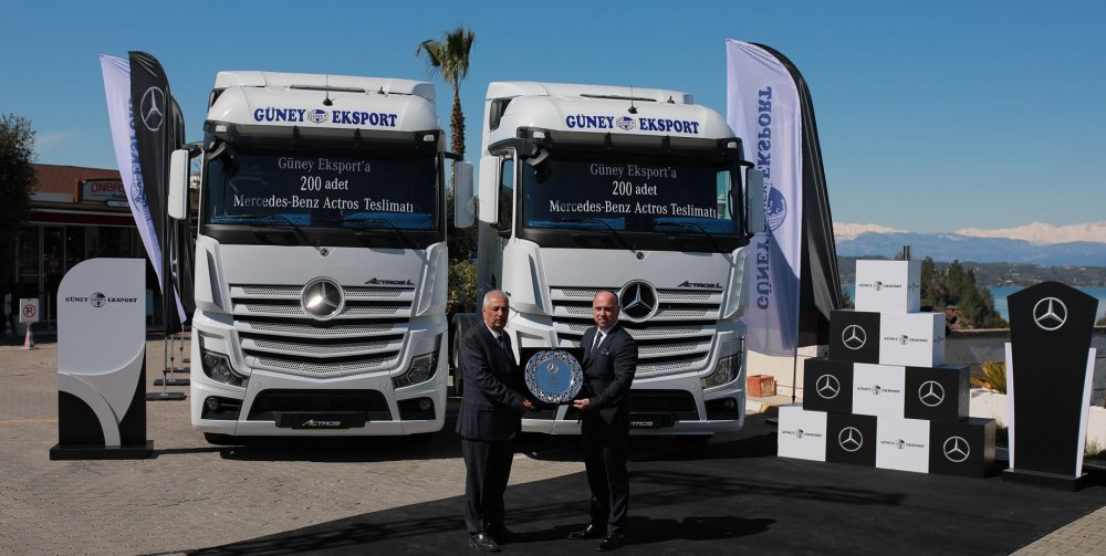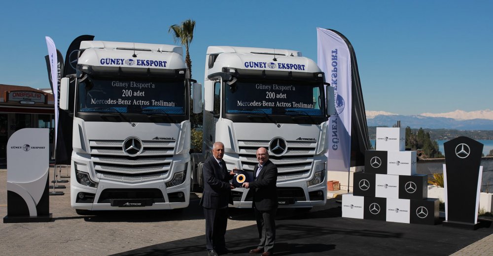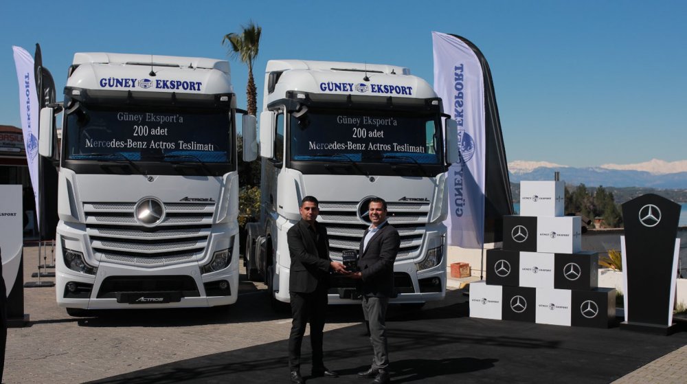 Sıvı gıda taşımacılığı sektöründe hizmet veren Güney Eksport, yeni teslimatla birlikte ilk kez Euro 6 motora sahip araçları da filosuna eklemiş oldu. Mercedes-Benz Türk’ten ilk aracını 2009 yılında satın alan Güney Eksport, teslim aldığı 200 adet Actros’u yurtiçi nakliye faaliyetlerinde kullanacak. Yeni araçları ile filosundaki Mercedes-Benz markalı araç sayısını 335’e çıkaran Güney Eksport, 2022 yılında Mercedes-Benz Türk’ten 200 adet araç daha satın almayı planlıyor.