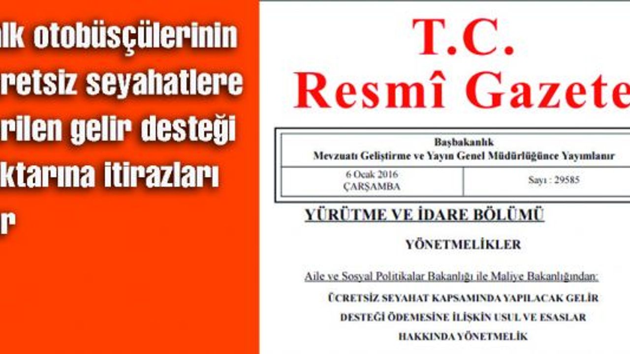Yönetmelik 6 Ocak 2016 tarih ve 29585 sayılı Resmi Gazete’de yayınlandı. Aile ve Sosyal Politikalar Bakanlığı ve Maliye Bakanlığı Ücretsiz Seyahat Kapsamında Yapılacak Gelir Desteği Ödemesine İlişkin Usul ve Esaslar Hakkındaki Yönetmeliği yayınladı. Yönetmelik ile belediyeler tarafından yetki verilen özel şahıs ya da şirkete ait şehiriçi toplu taşıma hizmeti veren her bir ulaşım aracı ile özel deniz ulaşım aracı için bunların işletmecilerine belediyeler aracılığıyla yapılacak gelir desteği ödemesine ilişkin usul ve esasları belirlendi. Yönetmelik ile başvuru, ödeme ve denetim esasları da belirlendi. Ödemeler belediyeler aracılığıyla yapılacak. Şehiriçi kara ve deniz taşımacılığında taksi, taksi dolmuş, dolmuş, rekreatif, turistik ve servis amaçlı kullanılan araçlar ücretsiz seyahat ve ödeme kapsamının dışında.