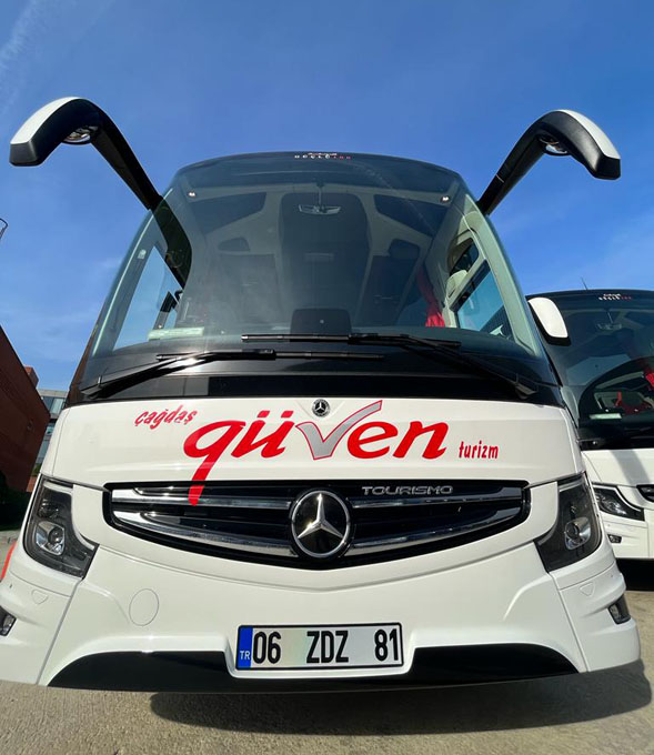 Çağdaş Güven Turizm filosunda yeni alınan 3 adet Tourismo ile birlikte toplam 20 adet öz mal otobüs bulunduğunu belirten Aytaç Nizam, “Firmamızda bireysel otobüsçü bulunmuyor. Özmal araçlarla çalışmayı tercih ediyoruz. Araçlarımızın 4 adeti Temsa Safir Plus diğer 16 adeti de Mercedes-Benz marka araçlardan oluşuyor” dedi.