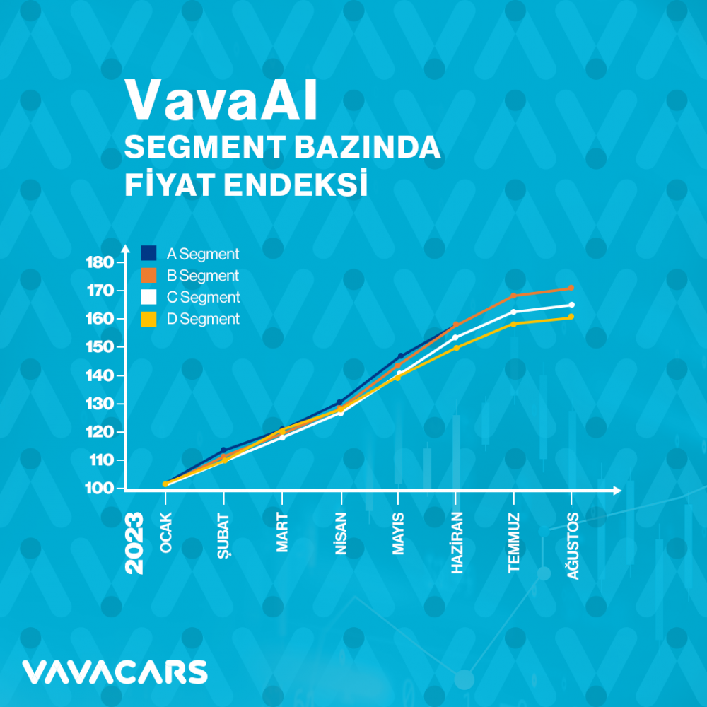 Sürekli artan fiyatlara karşı geliştirdikleri fiyat endeksinde kamuya açık verileri referans aldıklarını belirten VavaCars Perakende Grup Başkanı Serdıl Gözelekli, “Özellikle çip kriziyle birlikte üretimde yaşanan aksamalara paralel olarak sıfır araca erişim neredeyse imkansız hale geldi. Bu süreçte ihtiyacını karşılamak isteyen kullanıcılar, ikinci el otomobile yüksek bir talep gösterdi. Gelinen noktada 2023’ün ilk yarısında yüksek fiyat artışları yaşandı. Söz konusu dönemde Ticaret Bakanlığı hızlı bir adım atarak, 6 ay 6 bin kilometre uygulamasını 1 Ocak 2024 tarihine kadar uzattı. Bakanlığın fahiş fiyat artışlarının önüne geçmek için yıl sonuna kadar uygulamaya aldığı bir diğer önlem ise ikinci el motorlu kara taşıtlarının, sıfır araç satış fiyatının üzerinde bir fiyattan ilan yoluyla satılmasının yasaklanması olmuştu. Özellikle yılın başında yüksek oranlarda gerçekleşen aylık fiyat artış hızı, bakanlığımızın aldığı önlemler doğrultusunda yılın ortalarına doğru yavaşlamaya başladı. Bu yavaşlamanın etkisiyle ağustos ayındaki fiyat artışı, bir önceki aya göre yüzde 2 oranında gerçekleşti. Söz konusu süreçte temmuz ayına göre segment bazında artış oranı değişkenlik göstermezken, yıl başından bu yana en büyük artış A ve B segmentlerinde görüldü. Onları sırasıyla C ve D segmentleri takip etti” ifadelerini kullandı.