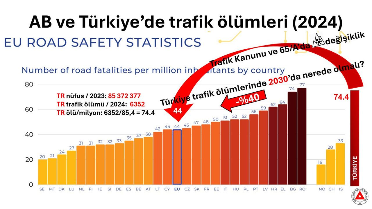 Türkiye'de 2024 yılında trafik ölümleri 6324 kişi ve trafik ölümlerinin milyon nüfus başına ortalaması 74.4 kişidir. Bu sayının AB ortalaması 44 kişidir. Türkiye'nin 3.2.2021 tarihli Cumhurbaşkanlığı kararı ile 2030 yılına kadar hedefi trafik ölümlerini 2020 yılının yarısına yani 2434 kişiye ve 2050’de de sıfıra indirme hedefi ve kararı vardır. 2024 yılı sonuçları ve özellikle motosiklet ölümlerinin artmasıyla bu hedefe ulaşmak için acil tedbirler alınmalı, bu amaçla genelde hızlar ve özelde de kent içi hızlar düşürülmelidir.