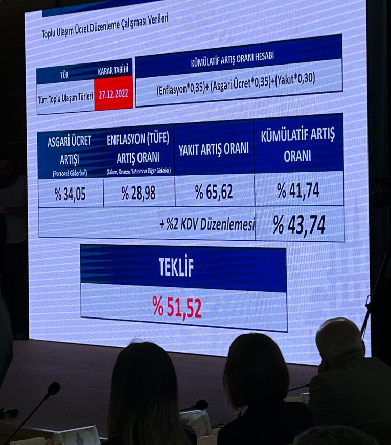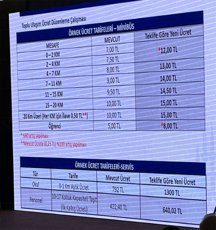 Yapılacak zam oranının ilk etapta yüzde 47 olarak düşünüldüğünü ancak daha sonra miktarın arttığına değinen Turgay Gül, “Yapılan görüşmeler sonucunda zam oranı daha sonra yüzde 51’e çıkartıldı. Fakat görüşmelerimizi hem kamu hem belediye tarafı ile sürdürdük ve zam oranını yüzde 60 civarına kadar çıkarttık. 0-1 km mesafe ücreti 792’den 1300 TL’ye çıktı. Personel tarafında da 422.40 TL’den 640.02 TL’ye çıktı” dedi.