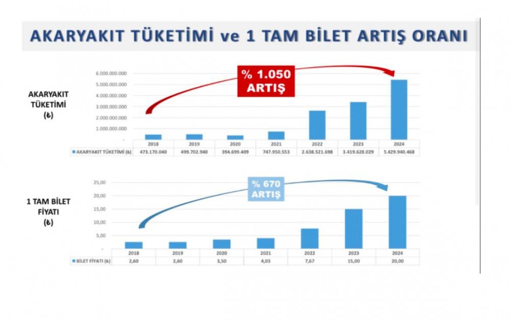 • Akaryakıt bedeli 2018’de 473 milyon TL iken, 2024 yılında yüzde 1050 artıllar 5,43 milyar TL’ye ulaştı.