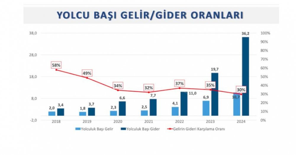 • 2018 yılında yolcu başına maliyet 3,4 TL iken, 2024 yılında bu rakam yüzde %965 artışlar 36,2 TL’ye çıktı.