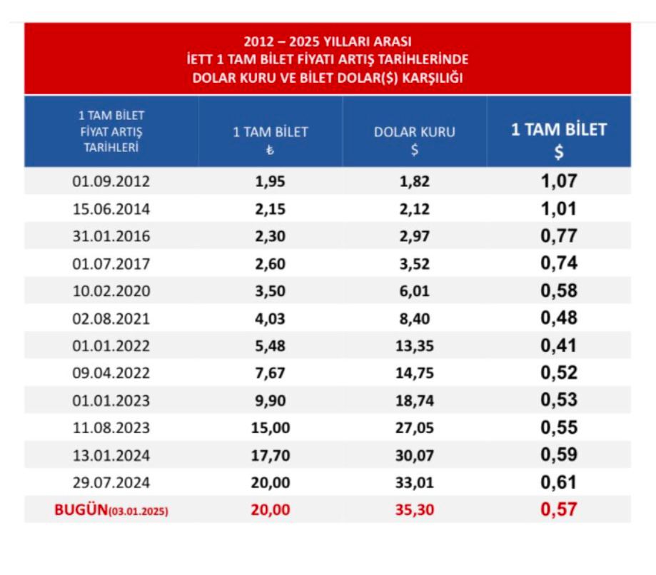 Geçmişte 1 tam bilet ücreti 1 dolara denk gelirken, bugün 20 TL yaklaşık 0,57 dolar. Ancak mazot fiyatları hızla arttı. Ağustos 2023’te 22 TL olan 1 litre mazot, Ocak 2025’te 44,74 TL’ye ulaştı. Bu süreçte mazot fiyatlarındaki artış %131,5 olarak kaydedildi.