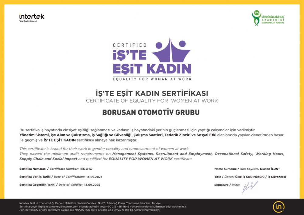 Sürdürülebilir Kalkınma Amaçlarının Toplumsal Cinsiyet Eşitliği ilkesi kapsamında eşit ve özgür bir gelecek hedefiyle başarılı işlere imza atan Borusan Otomotiv Grubu’na “İş’te Eşit Kadın Sertifikası” Sürdürülebilirlik Akademisi ve Intertek tarafından Borusan Oto İstinye tesisinde takdim edildi. Borusan Otomotiv İcra Kurulu Başkanı Hakan Tiftik, İcra Kurulu Üyeleri Simay Alsan ve Tuğba Paşalı Karacan, ilk otomotiv şirketi olarak hak edilen sertifikayı Sürdürülebilirlik Akademisi’nden Murat Sungur Bursa ve Intertek’ten Nurten İlunt’un elinden aldılar.