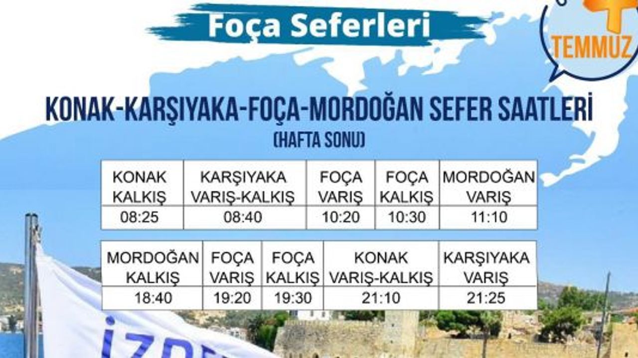 Karşıyaka-Foça gemisi; 08.25’te Karşıyaka’dan, 08.40’ta Konak’tan kalkacak; 10.10’da Mordoğan İskelesi’ne yanaşacak. 10.30’da buradan hareket edip, 11.10’da Foça’ya varacak. Dönüşte Foça’dan 18.40’ta kalkacak gemi, 19.20’de Mordoğan’da, 21.00’de Konak’ta ve 21.15’te Karşıyaka’da olacak.